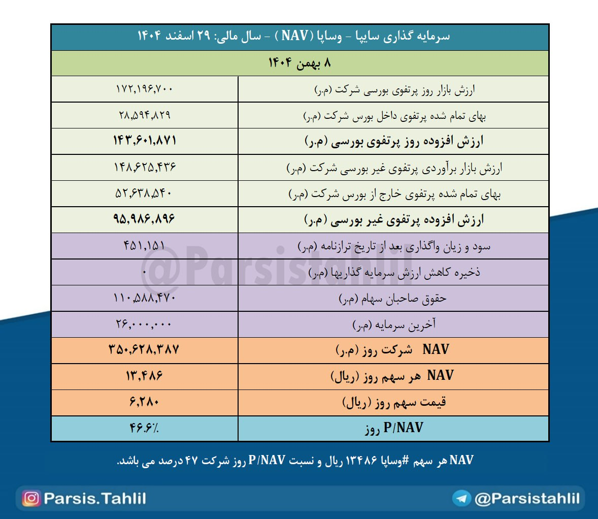 بدین ترتیب NAV هر سهم #وساپا 13486 ریال و نسبت P/NAV روز شرکت 47 درصد می باشد.