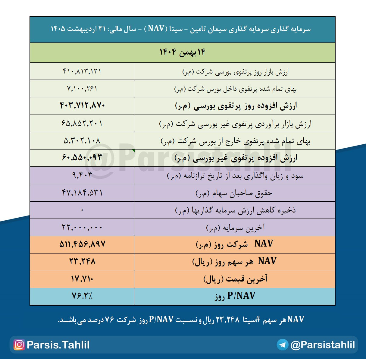 بدین ترتیب NAV هر سهم #سیتا 23,248 ریال و نسبت P/NAV روز شرکت 76 درصد می باشد.