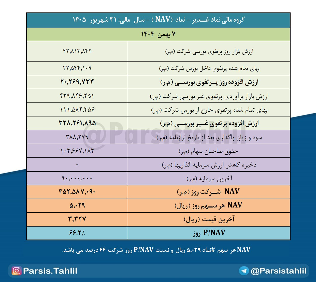 بدین ترتیب NAV هر سهم #نماد 5,029 ریال و نسبت P/NAV روز شرکت 66 درصد می باشد.