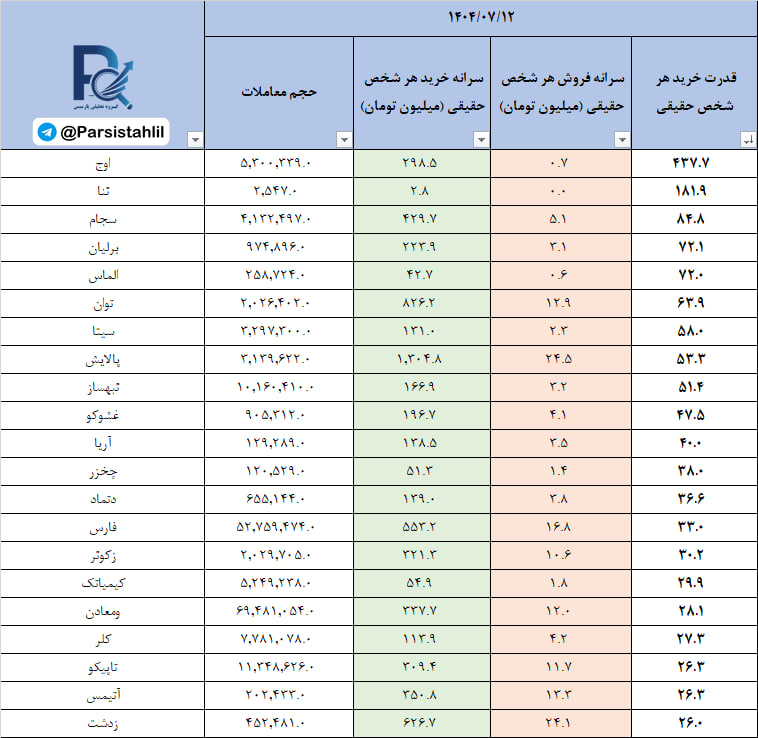 در جدول فوق نمادهایی که بالاترین نسبت سرانه خرید به سرانه فروش مشتریان حقیقی (قدرت خریدار حقیقی) در بازار امروز داشته اند قابل مشاهده است.