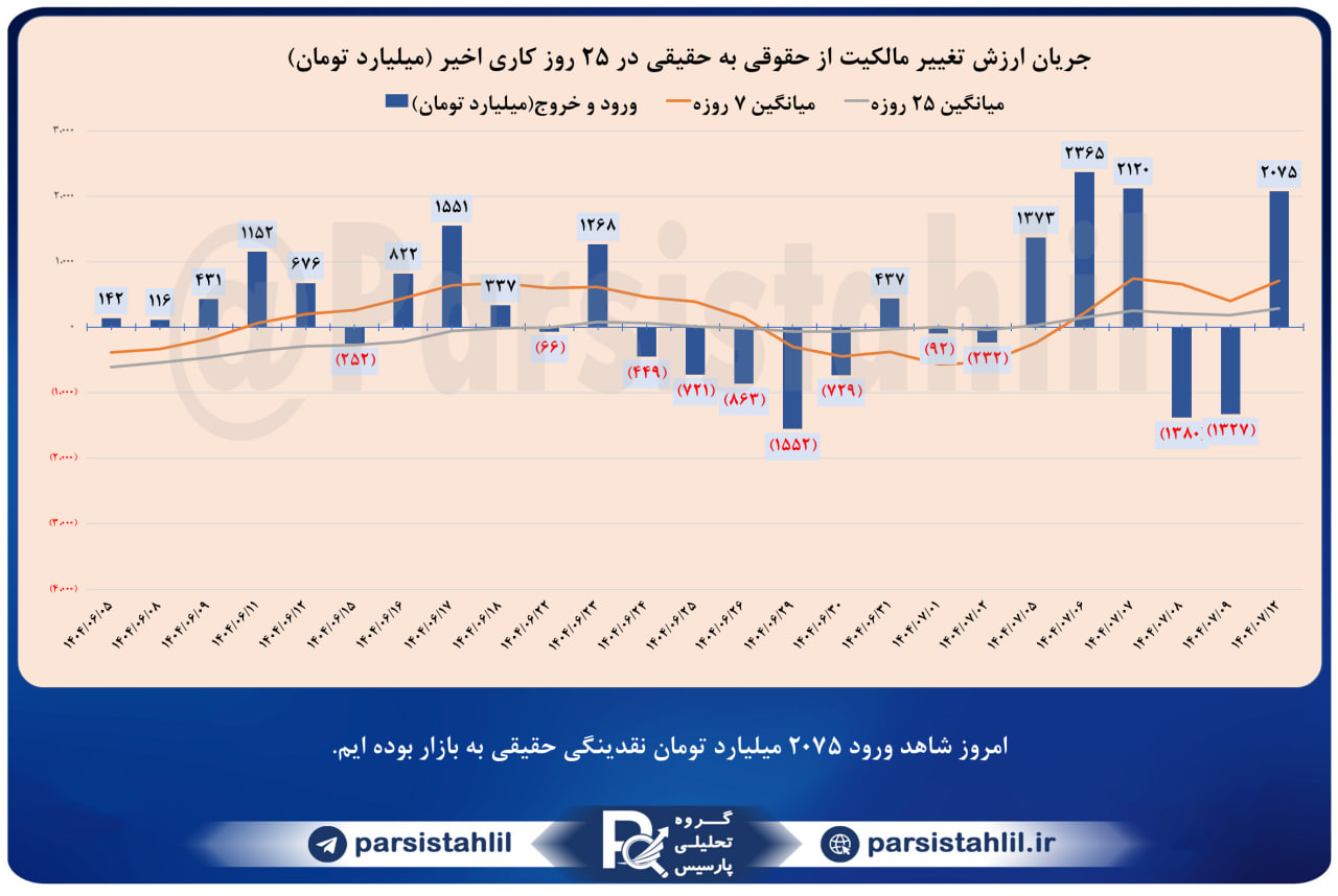 در بازار امروز 1404/07/12 مجموعا مبلغ 2075 میلیارد تومان ورود حقیقی به بازار داشته ایم. (سهام + حق تقدم + صندوق های قابل معامله سهامی)