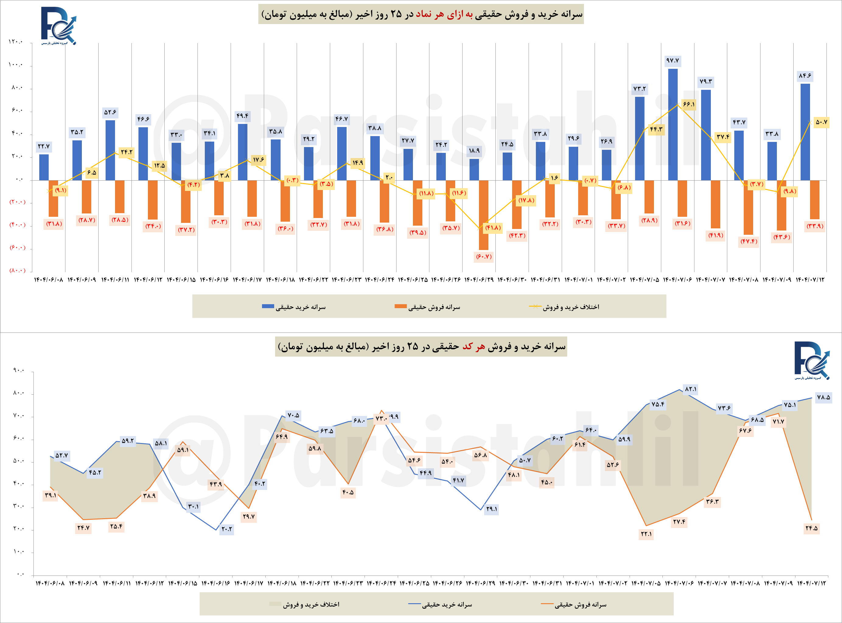 لازم به توضیح است تا این لحظه در بخش خرید، 79 درصد خریدها توسط حقیقی ها و 21 درصد توسط حقوقی ها انجام شده است.