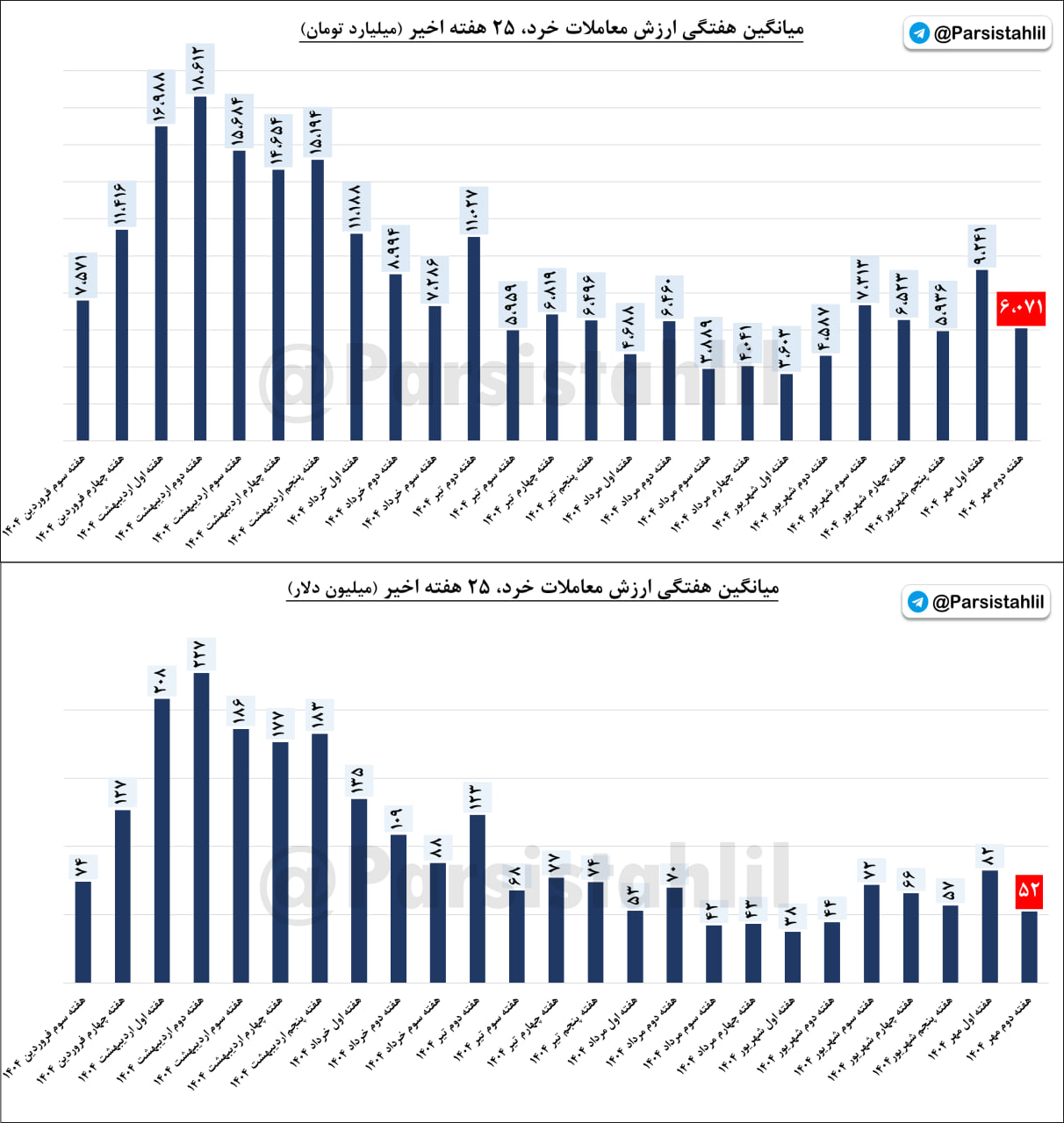 میانگین هفتگی معاملات خرد (ارزش معاملات دلاری) هفته دوم مهر 1404 به 52 میلیون دلار رسید.