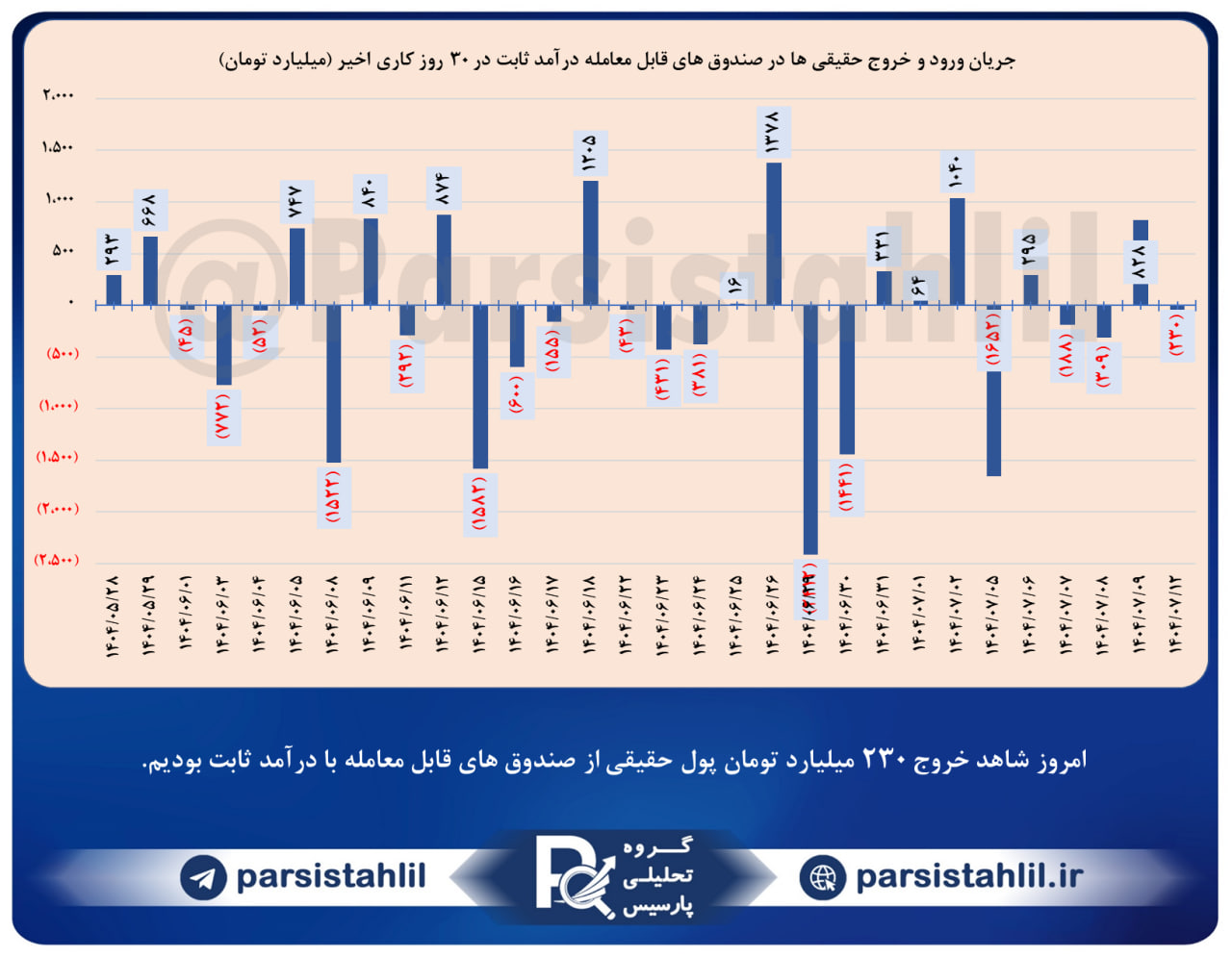 📊 امروز شاهد خروج 230 میلیارد تومان پول حقیقی از صندوق های قابل معامله با درآمد ثابت بودیم.