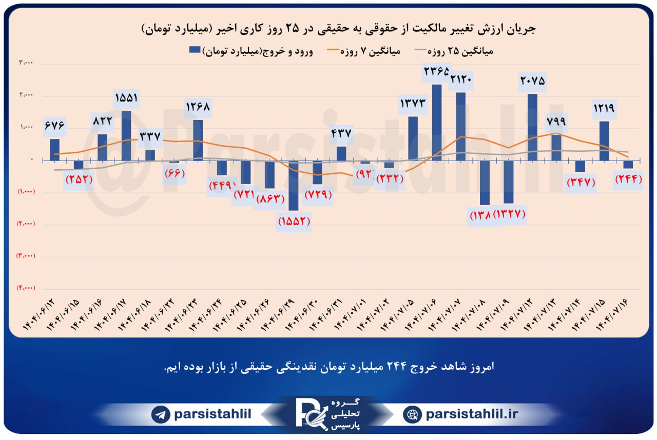 در بازار امروز 1404/07/16 مجموعا مبلغ 244 میلیارد تومان خروج حقیقی از بازار داشته ایم. (سهام + حق تقدم + صندوق های قابل معامله سهامی)