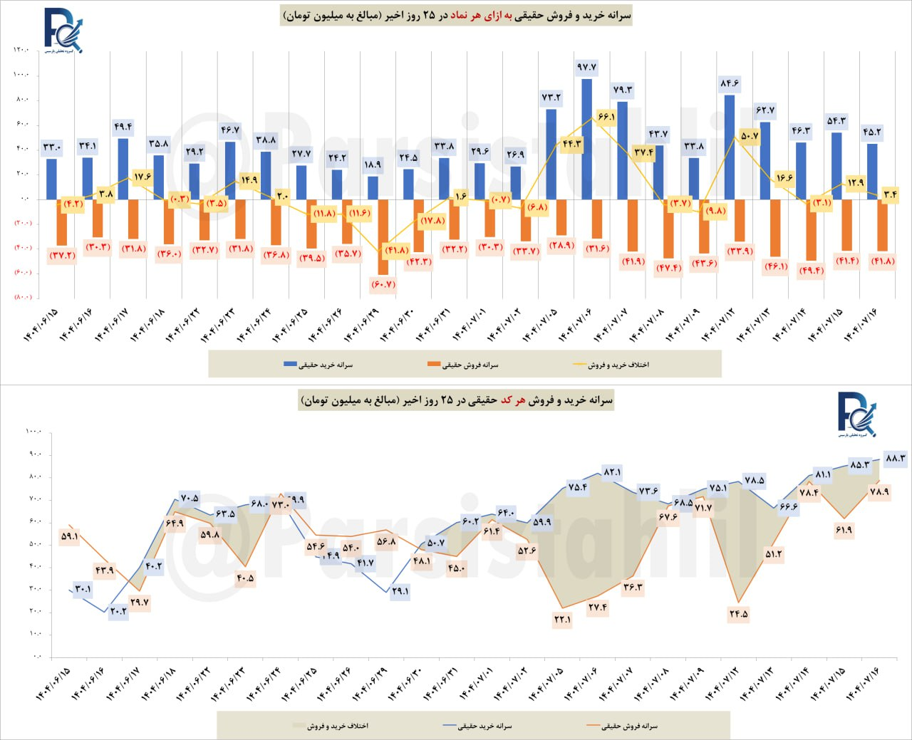 همچنین، در بازار امروز به ازای هر کد (میانگین نمادها) ، سرانه خرید حقیقی در حدود 88.3 میلیون تومان و سرانه فروش در حدود 78.9 میلیون تومان بود.