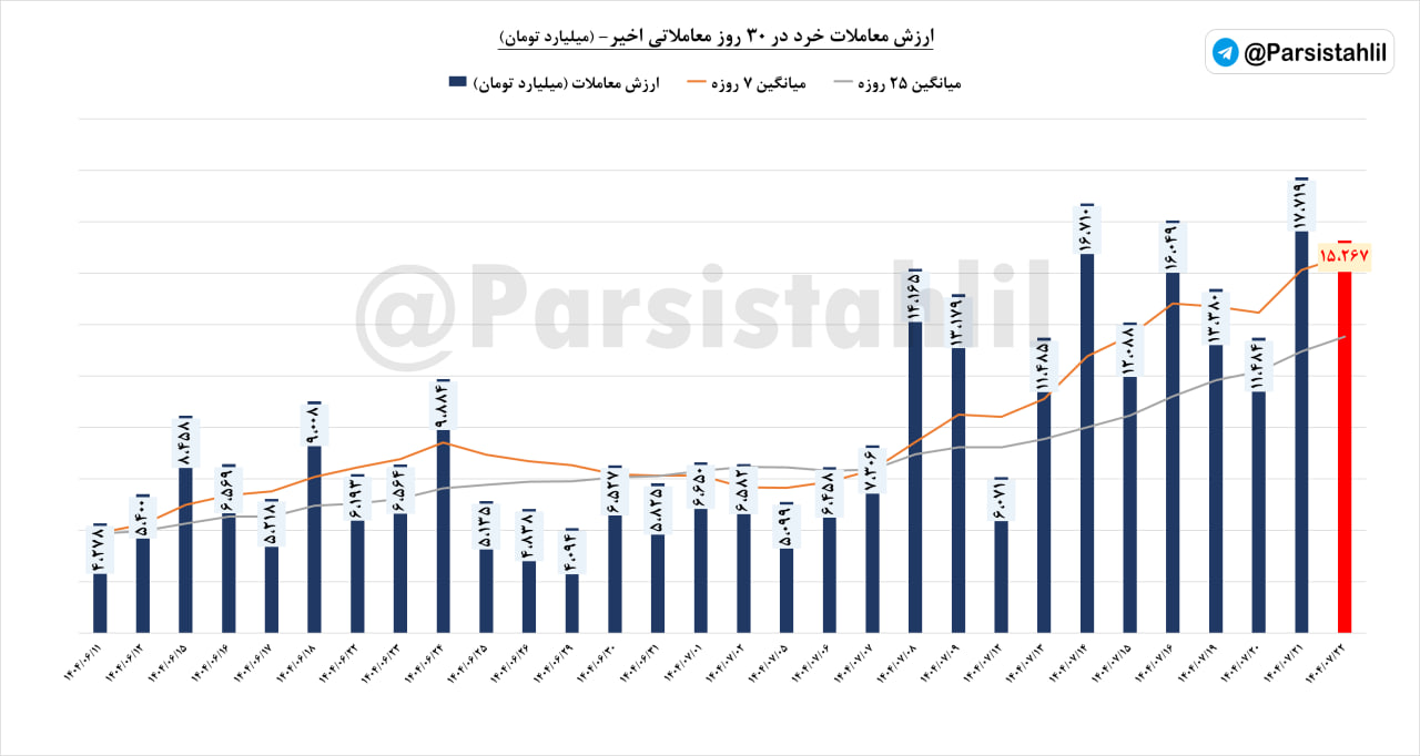 📊ارزش معاملات #خرد (سهام+حق تقدم+صندوق های سهامی) امروز بازار مورخ 22 مهر 1404 مبلغ 15267 میلیارد تومان بود.