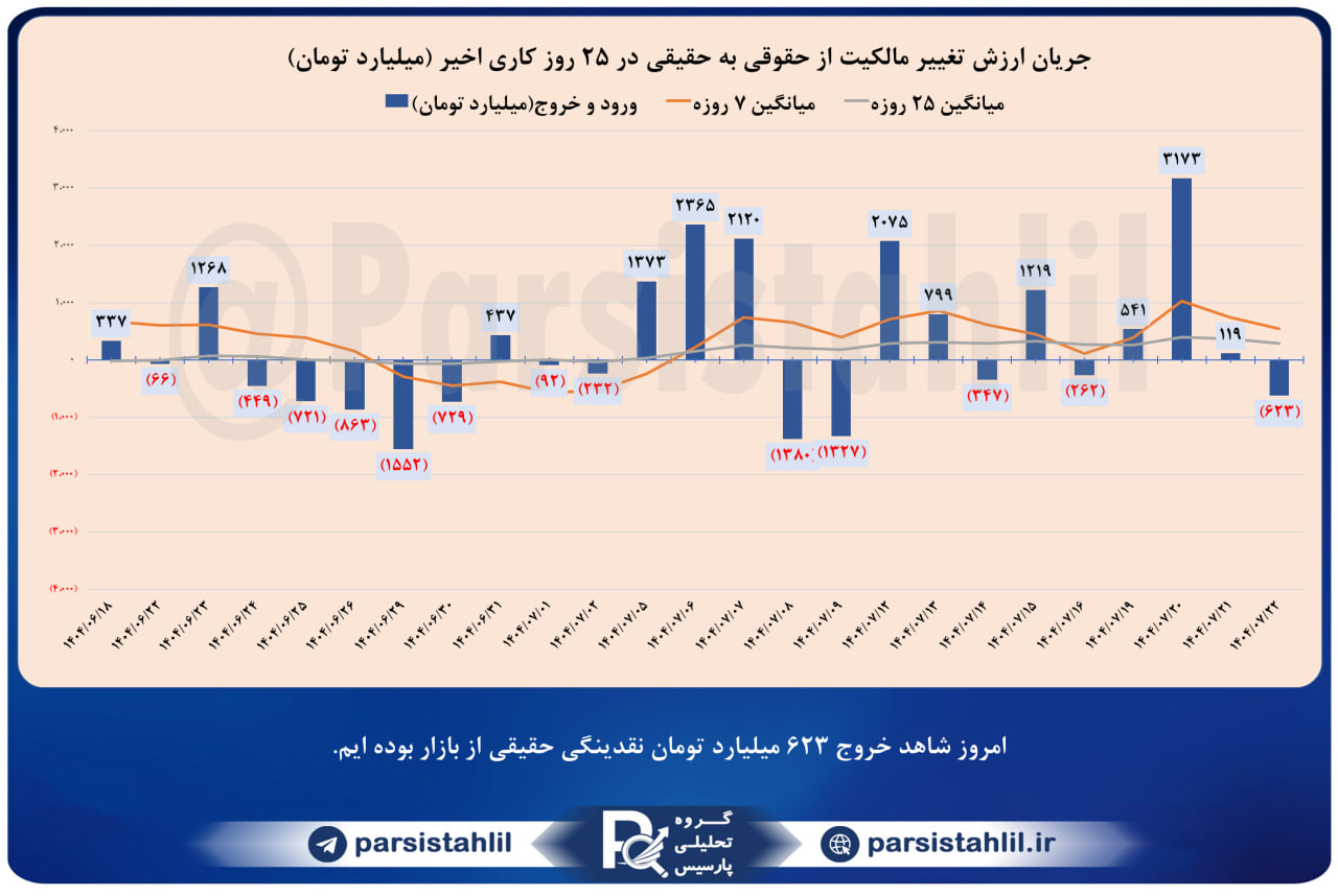 در بازار امروز 1404/07/22 مجموعا مبلغ 623 میلیارد تومان خروج حقیقی از بازار داشته ایم. (سهام + حق تقدم + صندوق های قابل معامله سهامی)