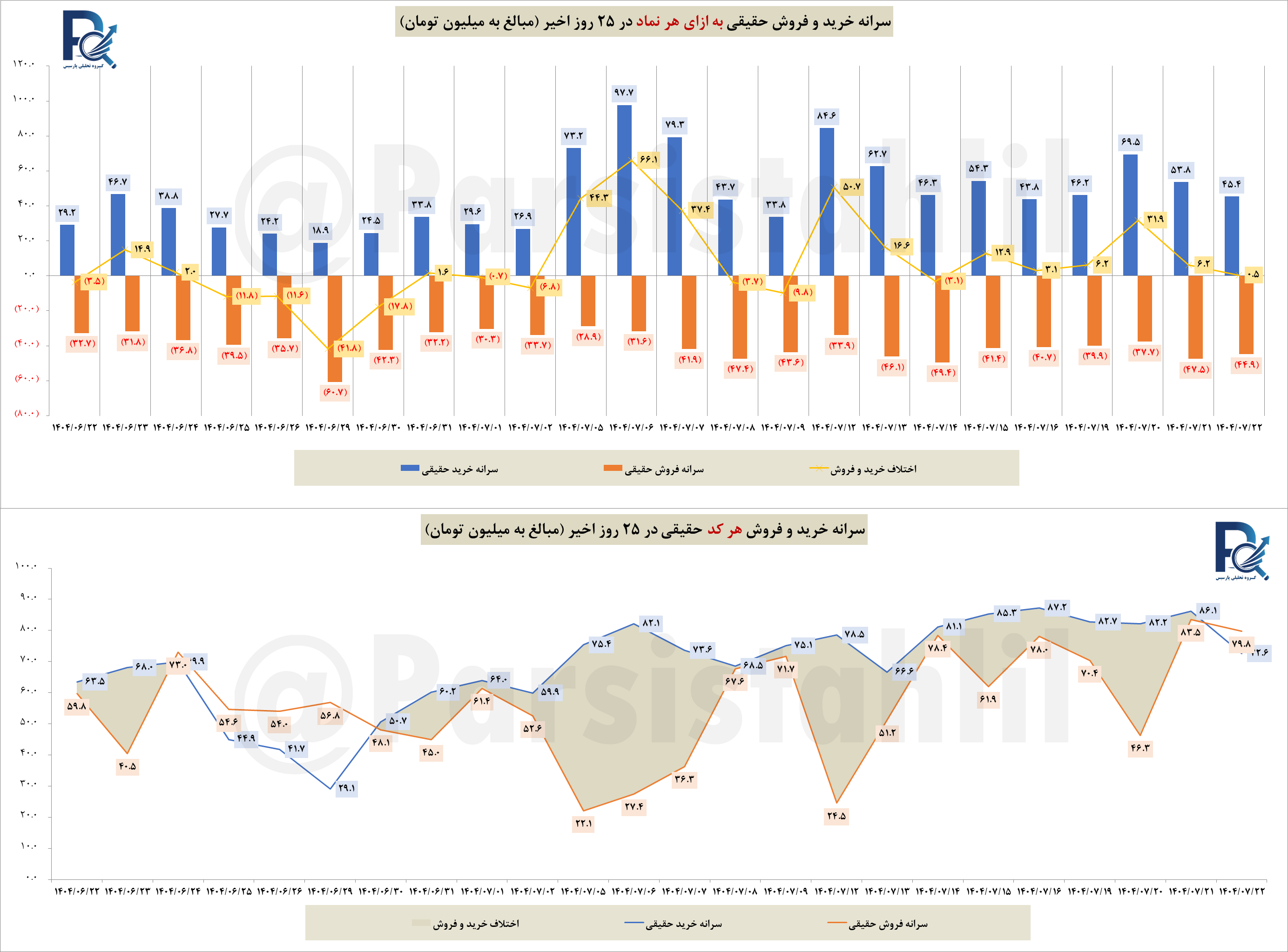 همچنین، در بازار امروز به ازای هر کد (میانگین نمادها) ، سرانه خرید حقیقی در حدود 72.6 میلیون تومان و سرانه فروش در حدود 79.8 میلیون تومان بود.