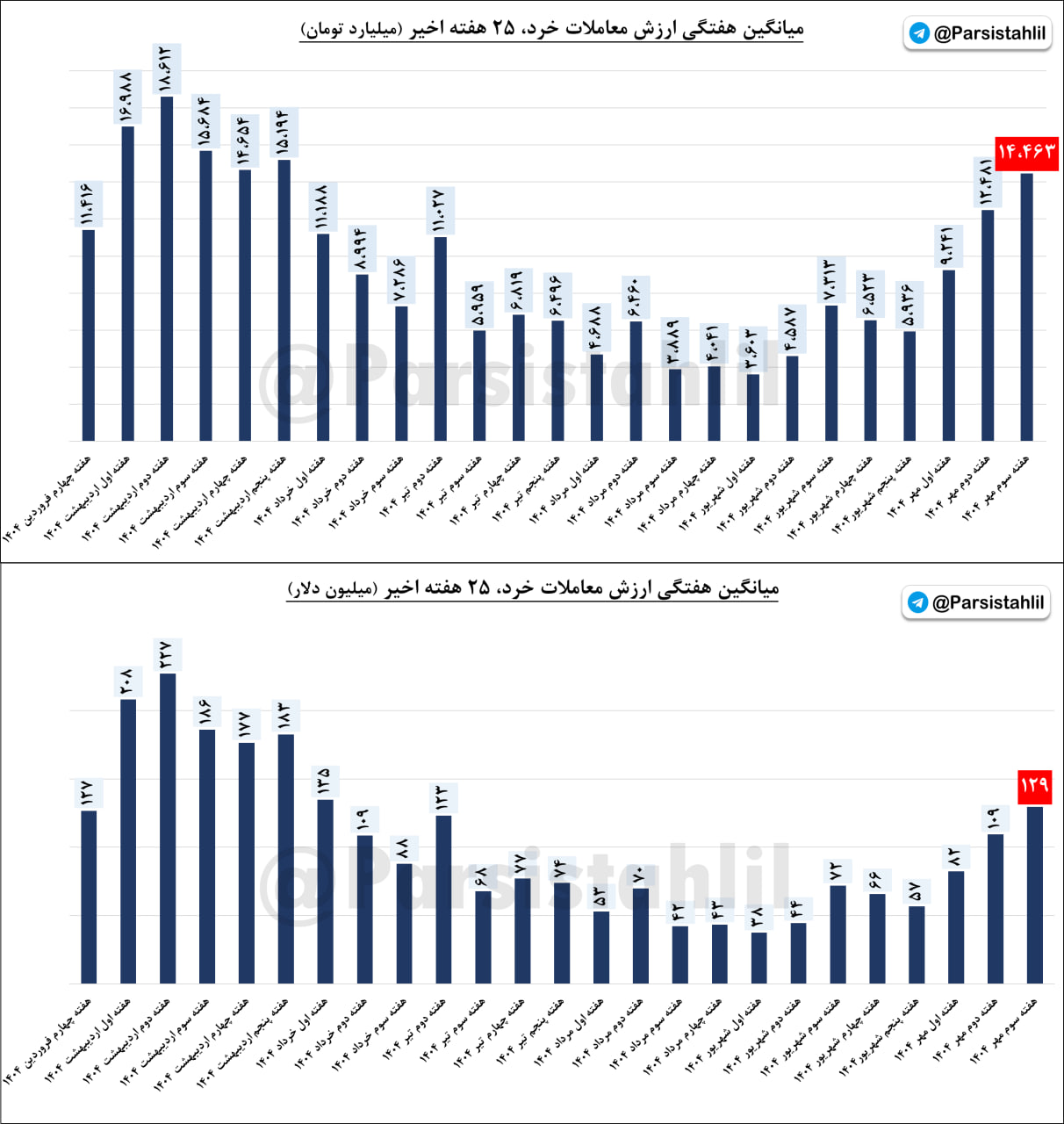 میانگین هفتگی معاملات خرد (ارزش معاملات دلاری) هفته سوم مهر 1404 به 129 میلیون دلار رسید.
