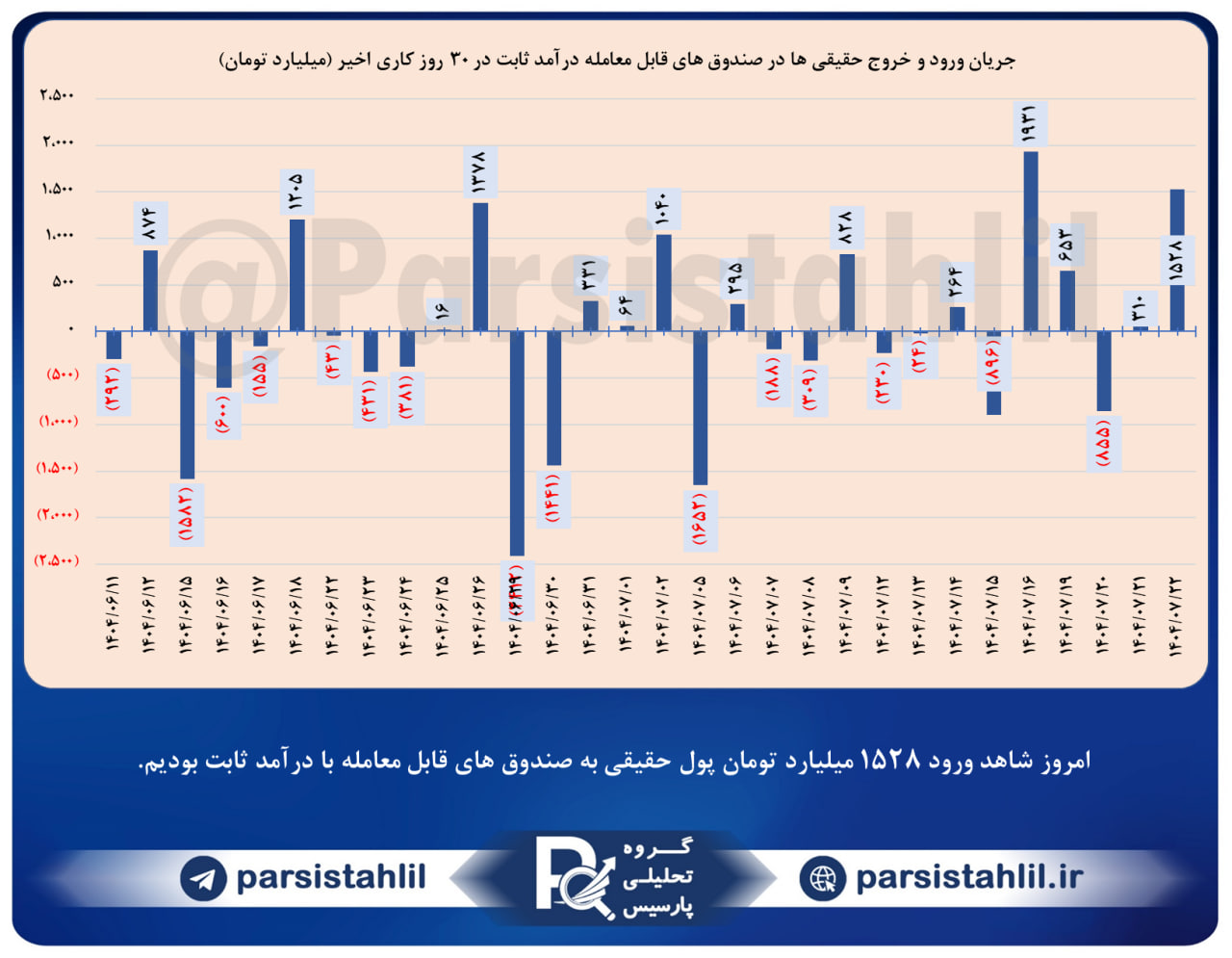 📊 امروز شاهد ورود 1528 میلیارد تومان پول حقیقی به صندوق های قابل معامله با درآمد ثابت بودیم.