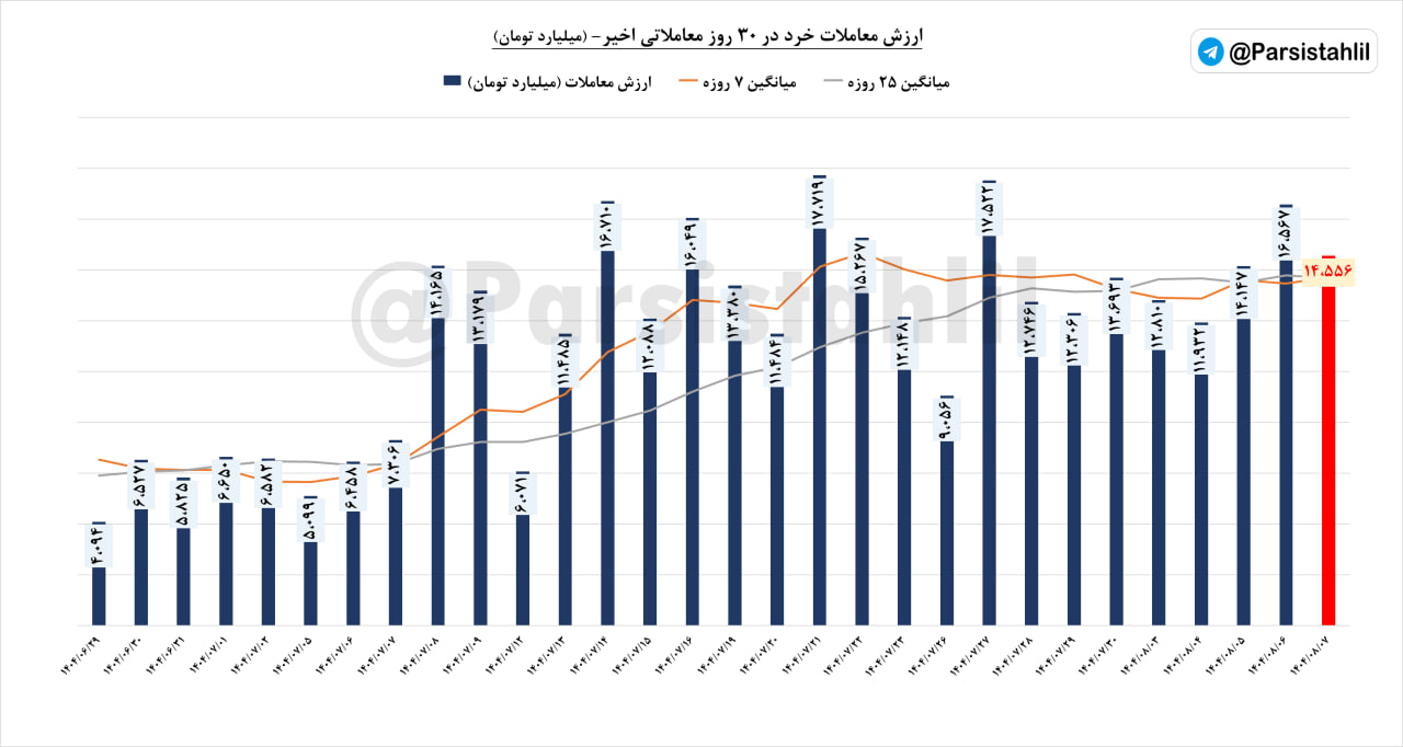 📊میانگین هفتگی معاملات خرد (ارزش معاملات ریالی) هفته اول آبان 1404 به 14002 میلیارد تومان رسید.