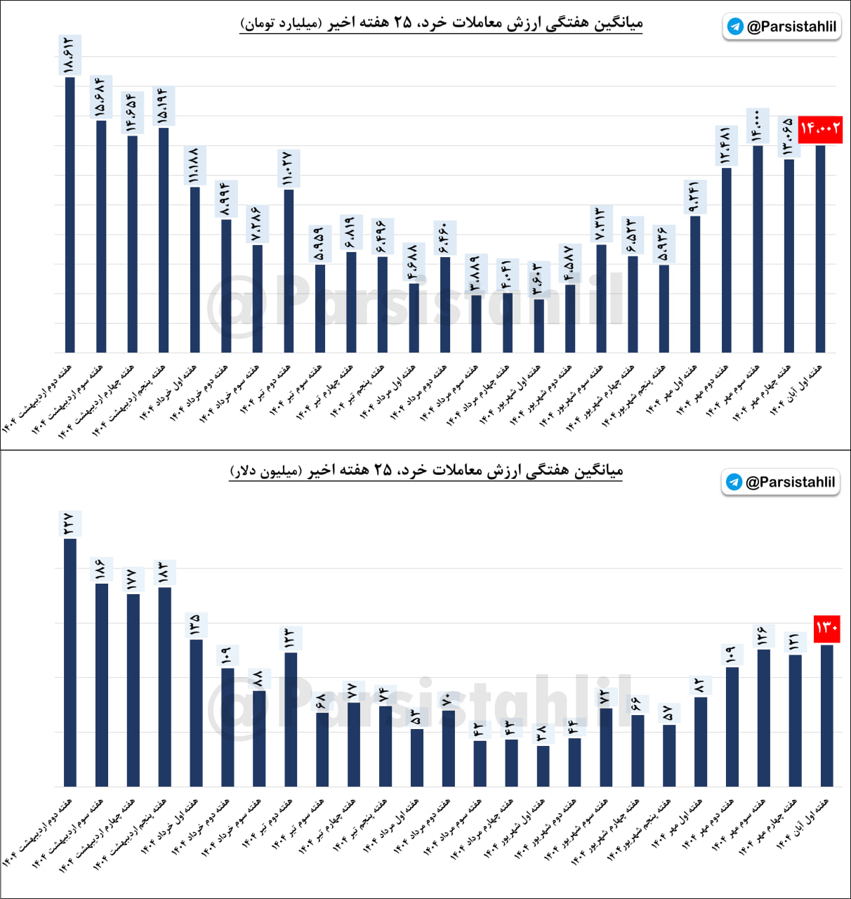 میانگین هفتگی معاملات خرد (ارزش معاملات دلاری) هفته اول آبان 1404 به 130 میلیون دلار رسید.