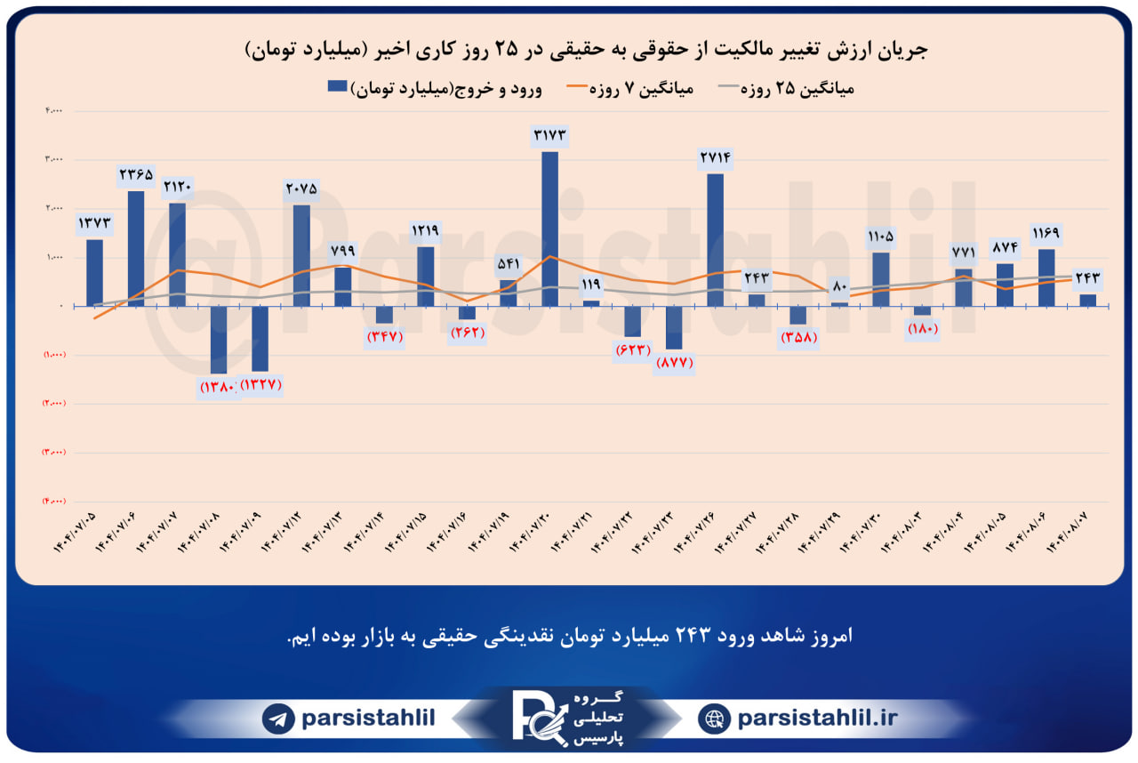 در بازار امروز 1404/08/07 مجموعا مبلغ 243 میلیارد تومان ورود حقیقی به بازار داشته ایم. (سهام + حق تقدم + صندوق های قابل معامله سهامی)