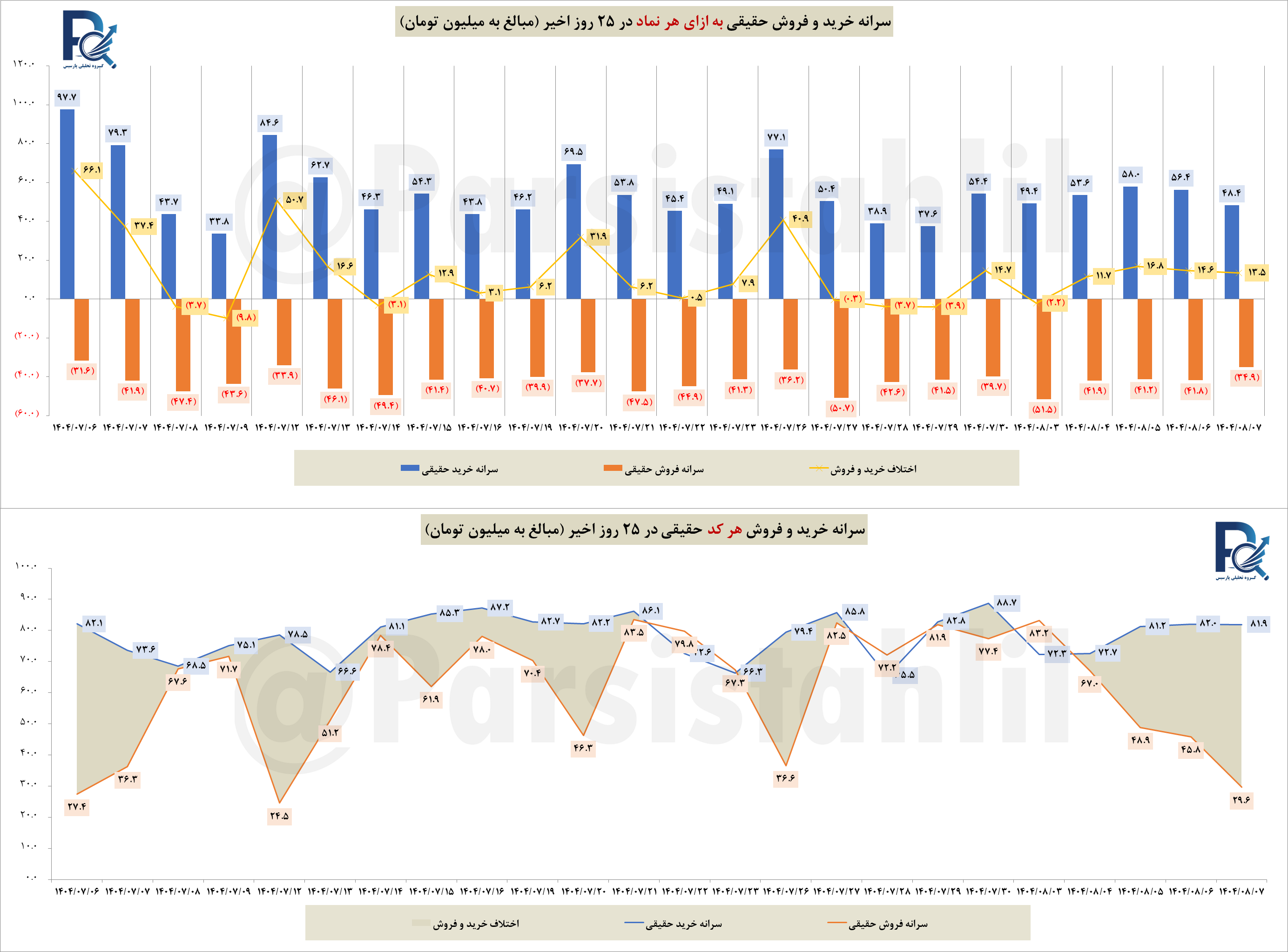 📊دربازار امروز 7 آبان 1404 سرانه خرید هر نماد در بازار ، در حدود 48.4 میلیون تومان و سرانه فروش در حدود 34.9 میلیون تومان بود.