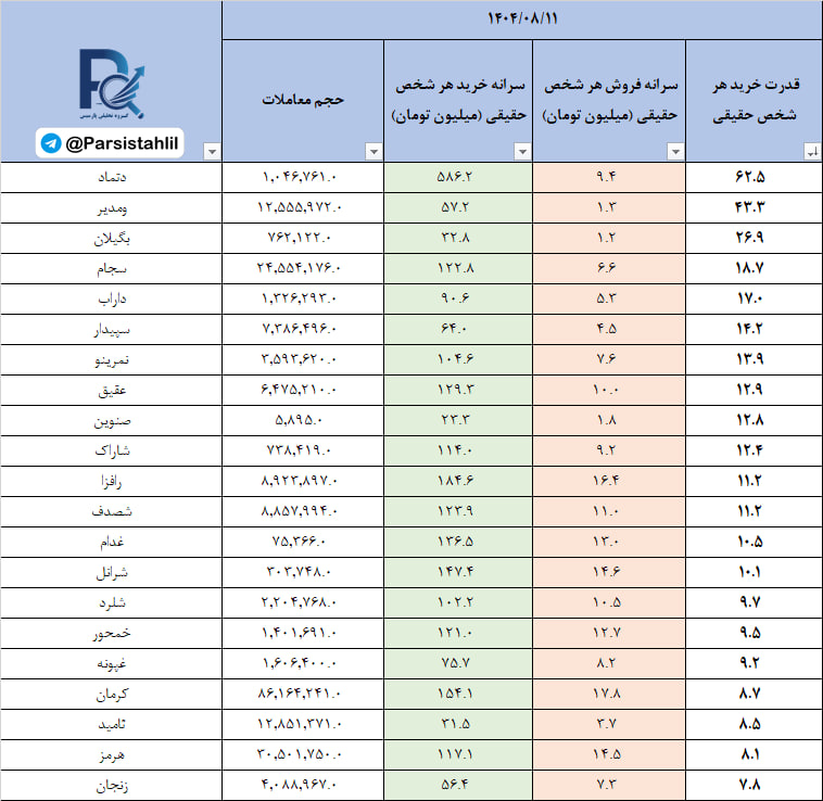 در جدول فوق نمادهایی که بالاترین نسبت سرانه خرید به سرانه فروش مشتریان حقیقی (قدرت خریدار حقیقی) در بازار امروز داشته اند قابل مشاهده است.