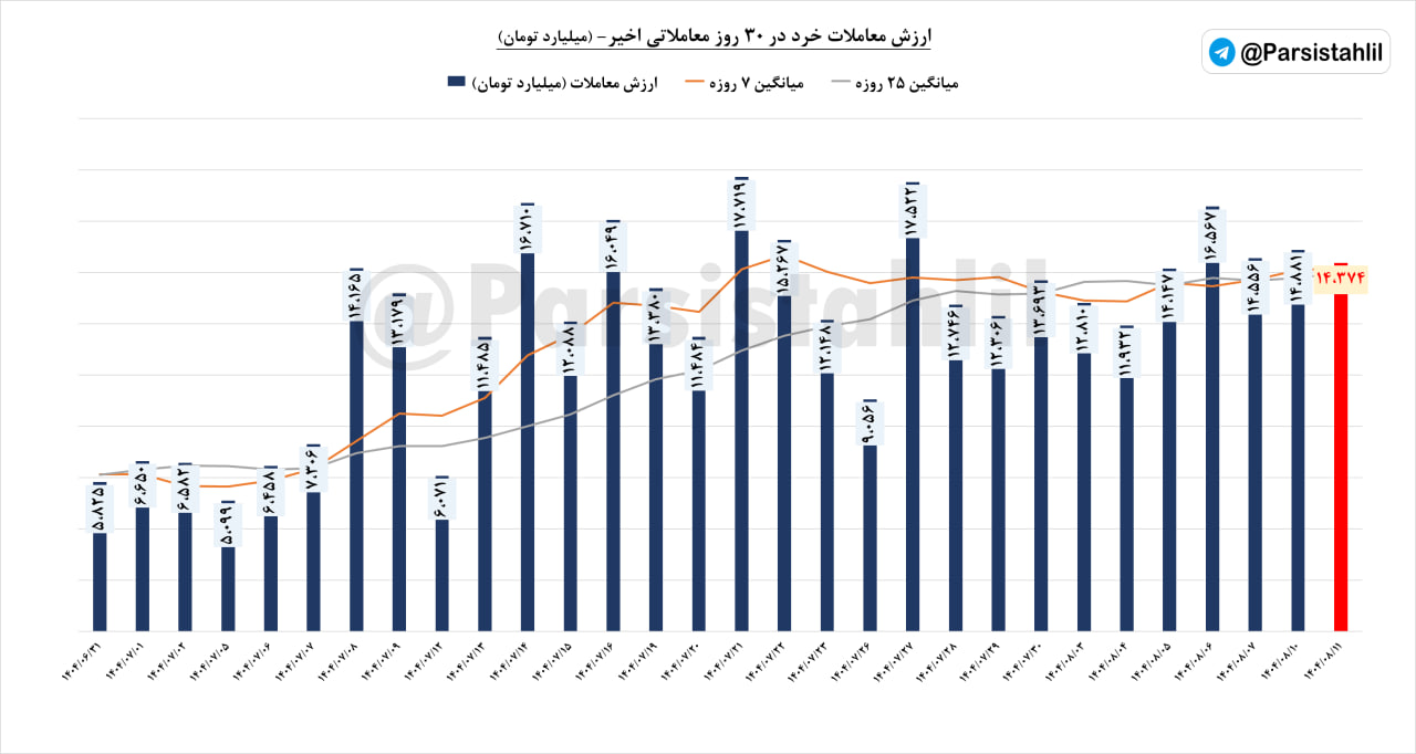 📊ارزش معاملات #خرد (سهام+حق تقدم+صندوق های سهامی) امروز بازار مورخ 11 آبان 1404 مبلغ 14374 میلیارد تومان بود.