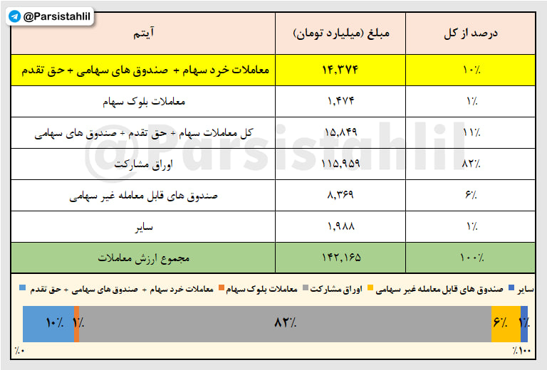 همانطور که در جدول فوق مشاهده می نمایید ارزش کل معاملات امروز بازار 142,165 میلیارد تومان بوده که از این مبلغ 14,374 میلیارد تومان آن مربوط به معاملات خرد سهام و حق تقدم و صندوق های سهامی بوده است.