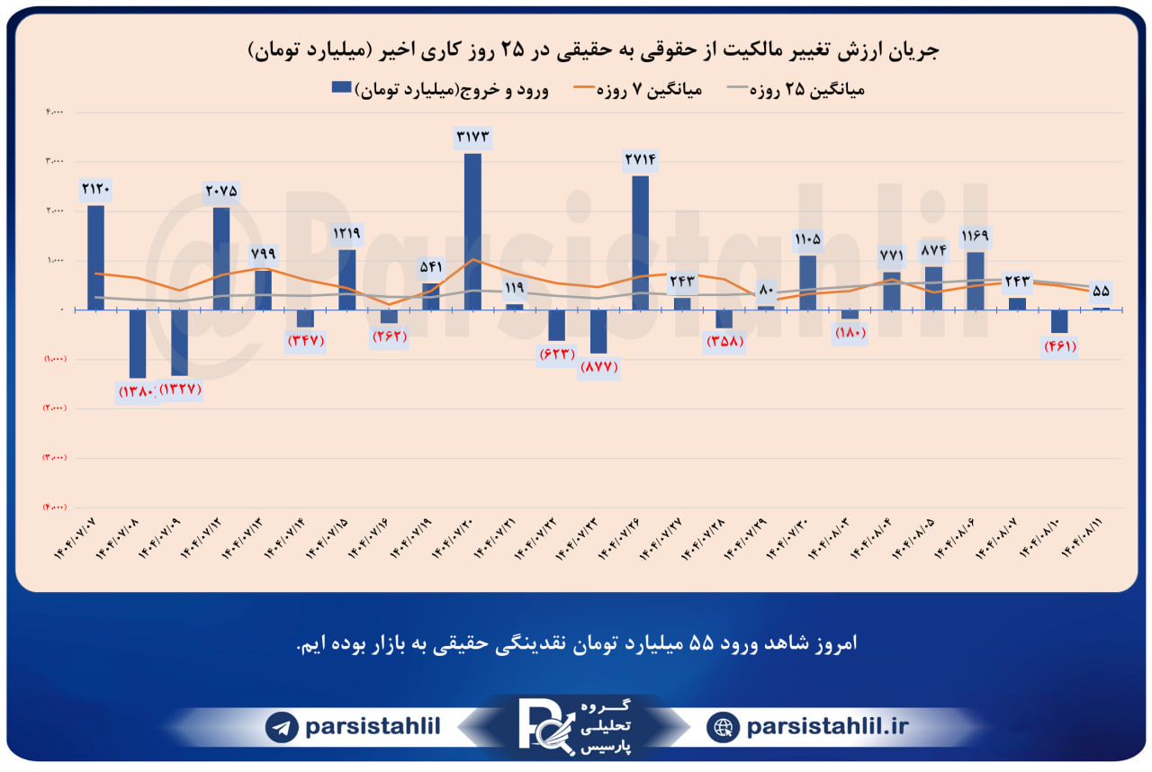 در بازار امروز 1404/08/11 مجموعا مبلغ 55 میلیارد تومان ورود حقیقی به بازار داشته ایم. (سهام + حق تقدم + صندوق های قابل معامله سهامی)