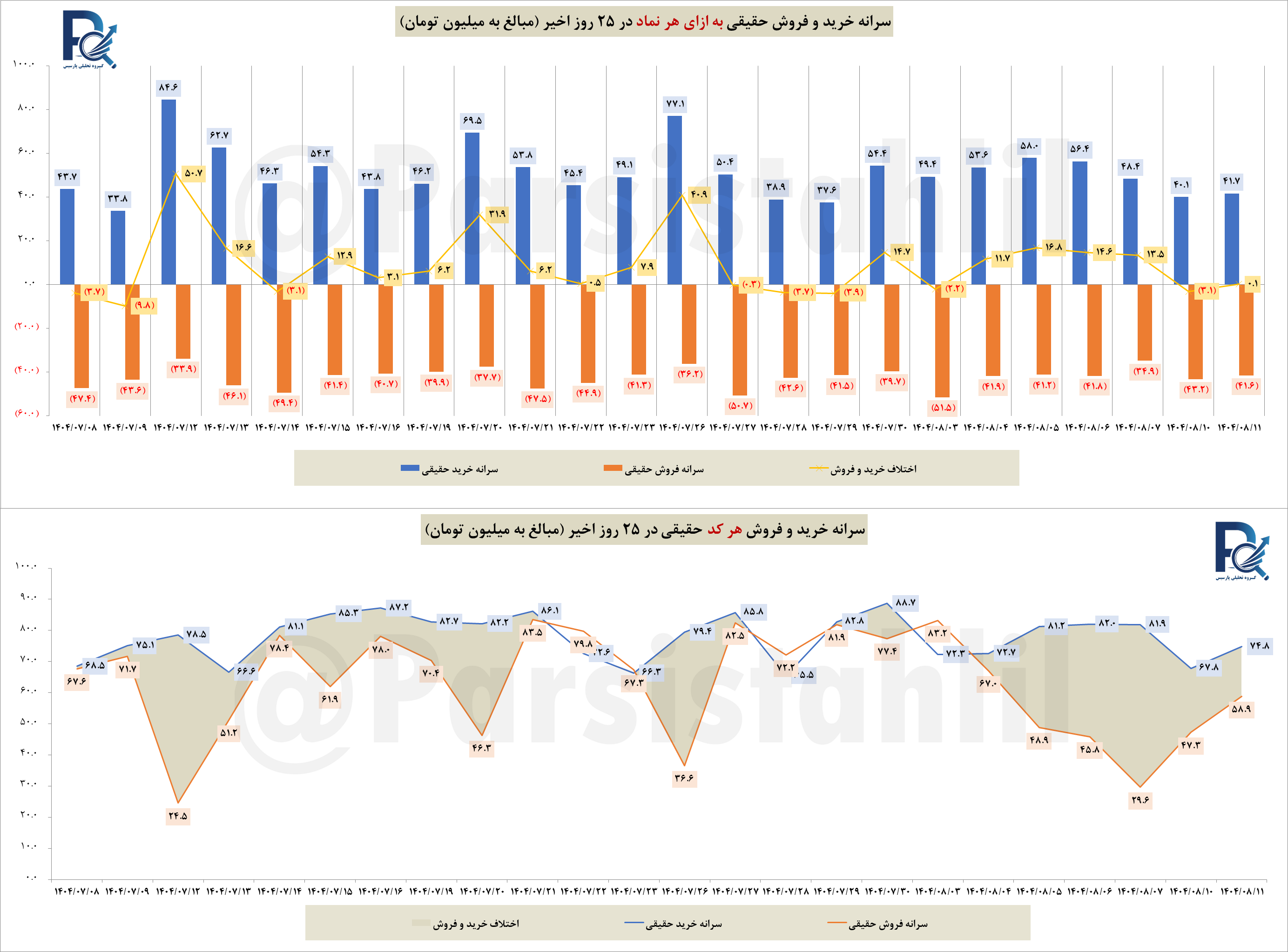 📊دربازار امروز 11 آبان 1404 سرانه خرید هر نماد در بازار ، در حدود 41.7 میلیون تومان و سرانه فروش در حدود 41.6 میلیون تومان بود.