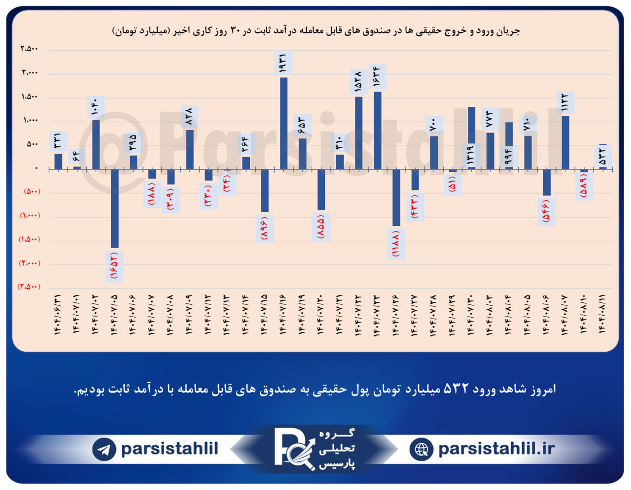 📊 امروز شاهد ورود 532 میلیارد تومان پول حقیقی به صندوق های قابل معامله با درآمد ثابت بودیم.