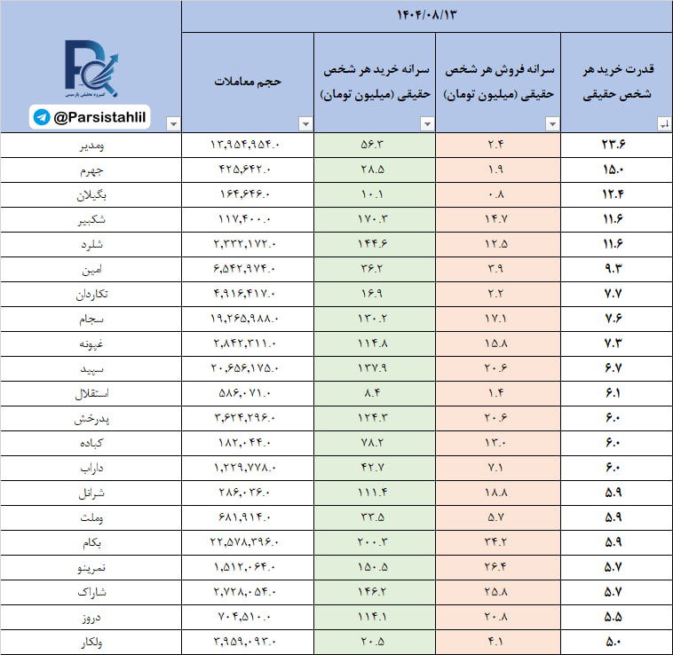در جدول فوق نمادهایی که بالاترین نسبت سرانه خرید به سرانه فروش مشتریان حقیقی (قدرت خریدار حقیقی) در بازار امروز داشته اند قابل مشاهده است.