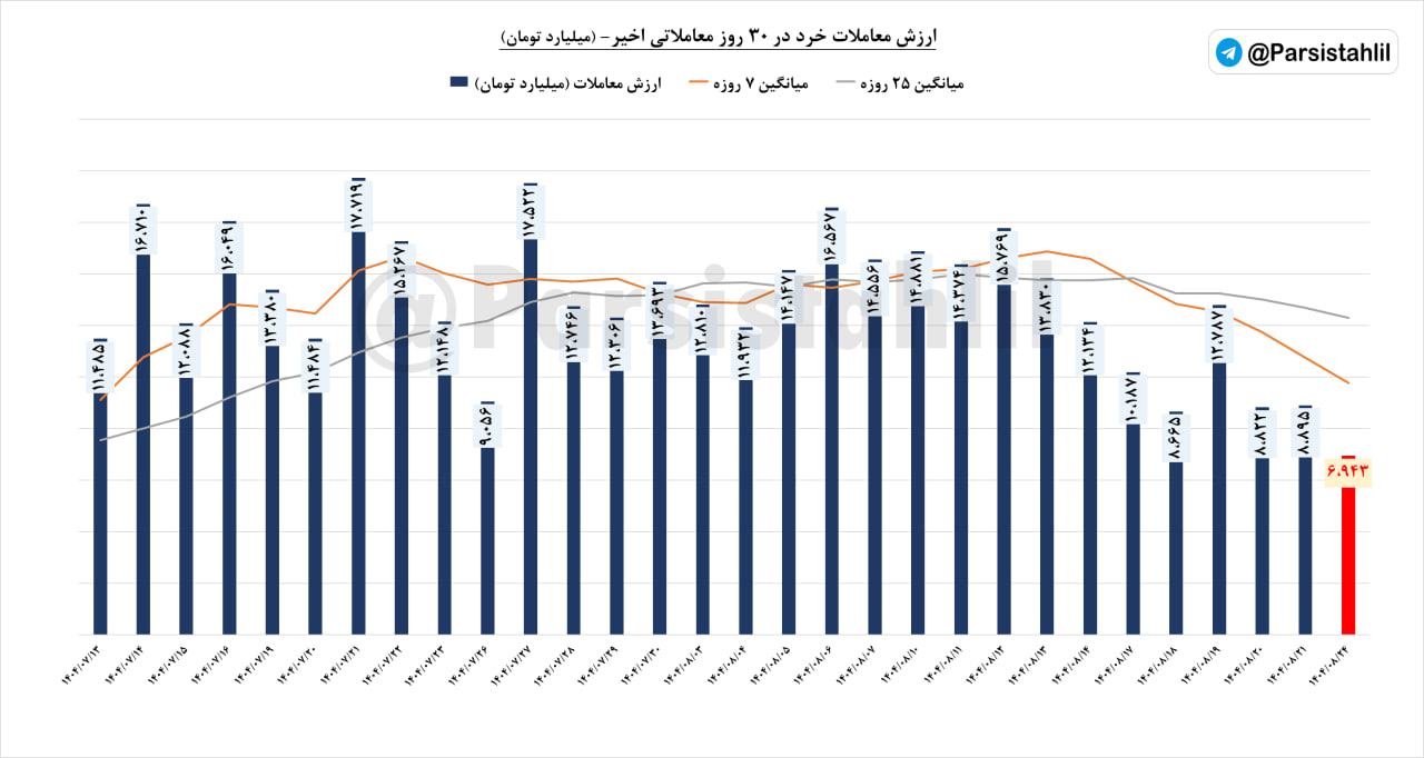 📊میانگین هفتگی معاملات خرد (ارزش معاملات ریالی) هفته چهارم آبان 1404 به 6943 میلیارد تومان رسید.