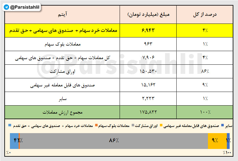 همانطور که در جدول فوق مشاهده می نمایید ارزش کل معاملات امروز بازار 175,822 میلیارد تومان بوده که از این مبلغ 6,943 میلیارد تومان آن مربوط به معاملات خرد سهام و حق تقدم و صندوق های سهامی بوده است.