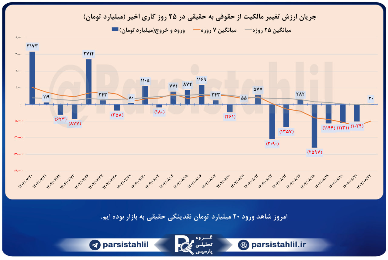 در بازار امروز 1404/08/24 مجموعا مبلغ 20 میلیارد تومان ورود حقیقی به بازار داشته ایم. (سهام + حق تقدم + صندوق های قابل معامله سهامی)