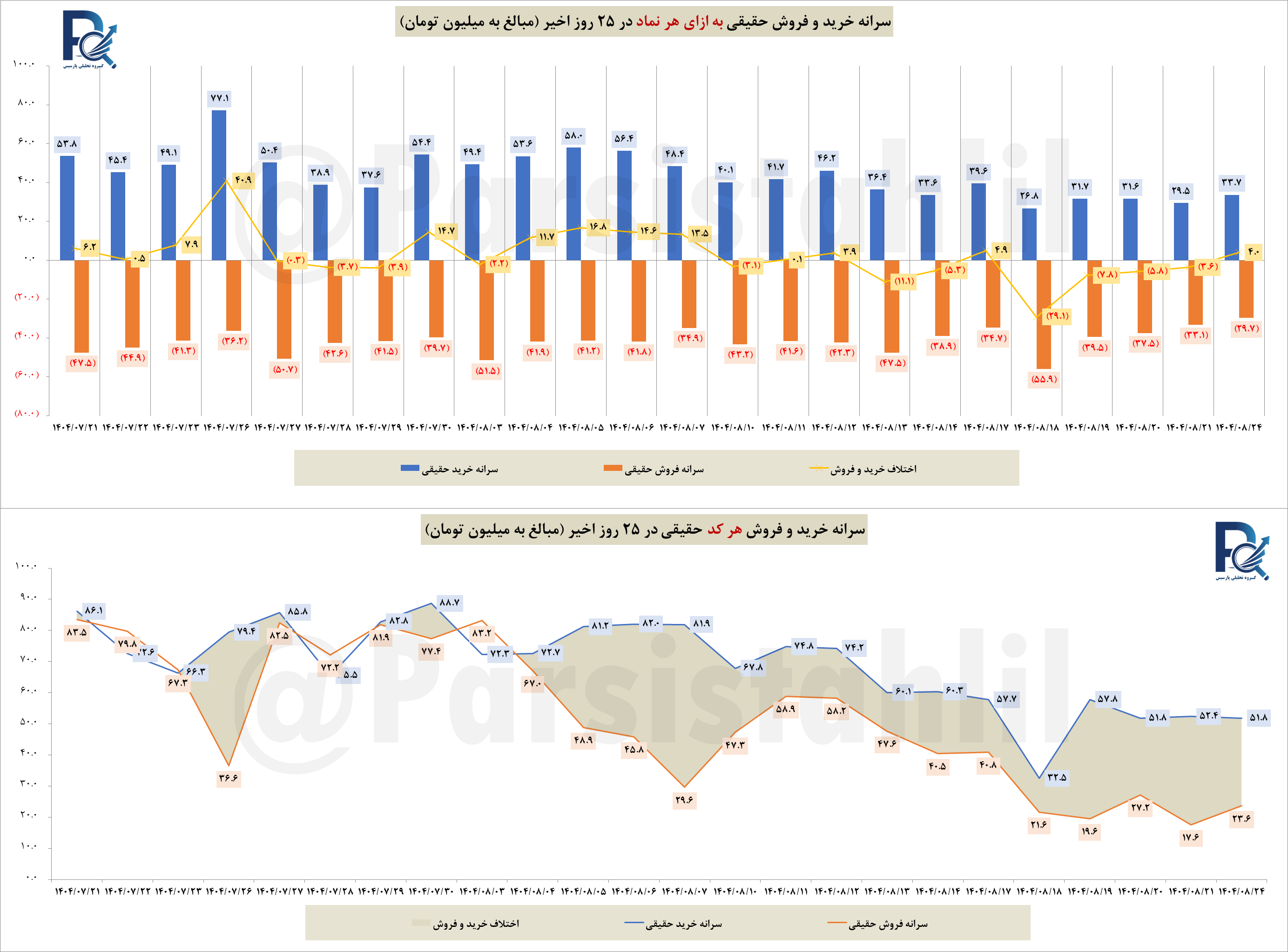 همچنین، در بازار امروز به ازای هر کد (میانگین نمادها) ، سرانه خرید حقیقی در حدود 51.8 میلیون تومان و سرانه فروش در حدود 23.6 میلیون تومان بود.