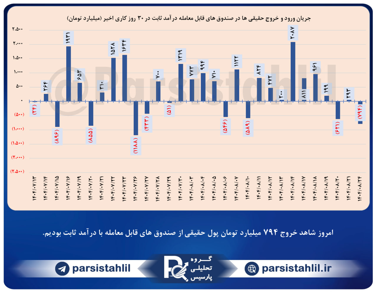 📊 امروز شاهد خروج 794 میلیارد تومان پول حقیقی از صندوق های قابل معامله با درآمد ثابت بودیم.