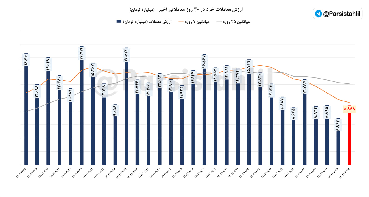 📊ارزش معاملات #خرد (سهام+حق تقدم+صندوق های سهامی) امروز بازار مورخ 25 آبان 1404 مبلغ 8968 میلیارد تومان بود.