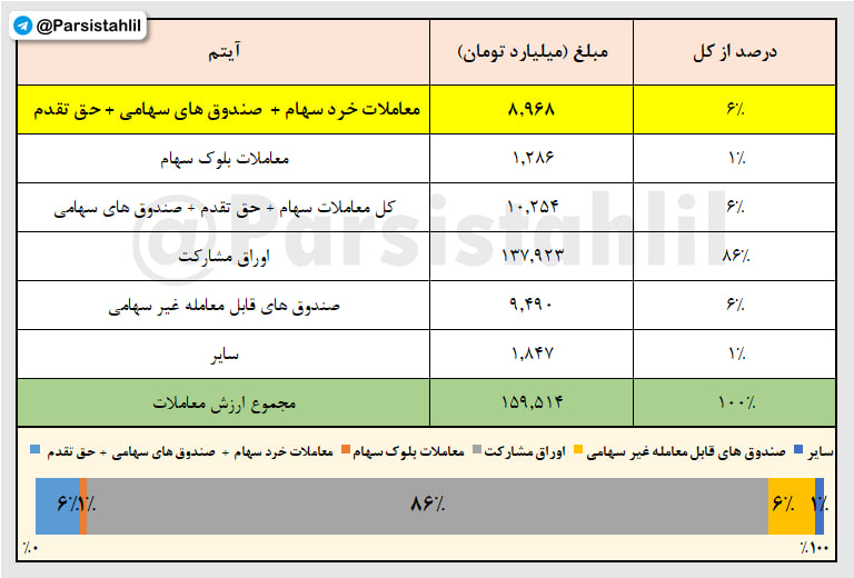 همانطور که در جدول فوق مشاهده می نمایید ارزش کل معاملات امروز بازار 159,514 میلیارد تومان بوده که از این مبلغ 8,968 میلیارد تومان آن مربوط به معاملات خرد سهام و حق تقدم و صندوق های سهامی بوده است.