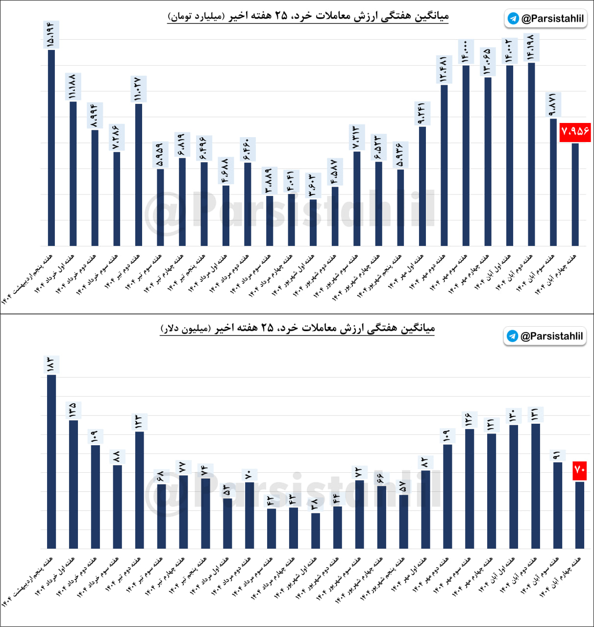 میانگین هفتگی معاملات خرد (ارزش معاملات دلاری) هفته چهارم آبان 1404 به 70 میلیون دلار رسید.
