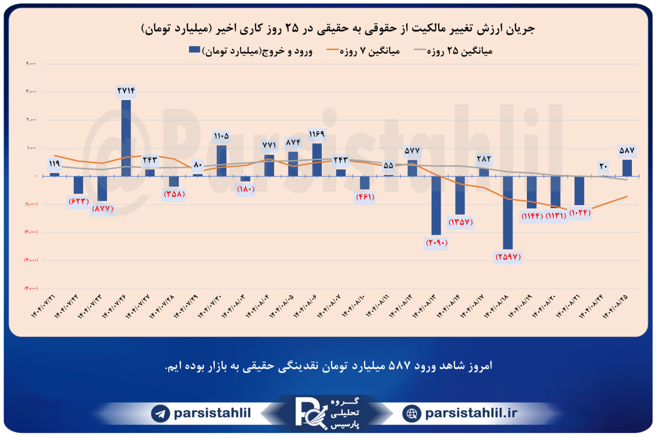 در بازار امروز 1404/08/25 مجموعا مبلغ 587 میلیارد تومان ورود حقیقی به بازار داشته ایم. (سهام + حق تقدم + صندوق های قابل معامله سهامی)