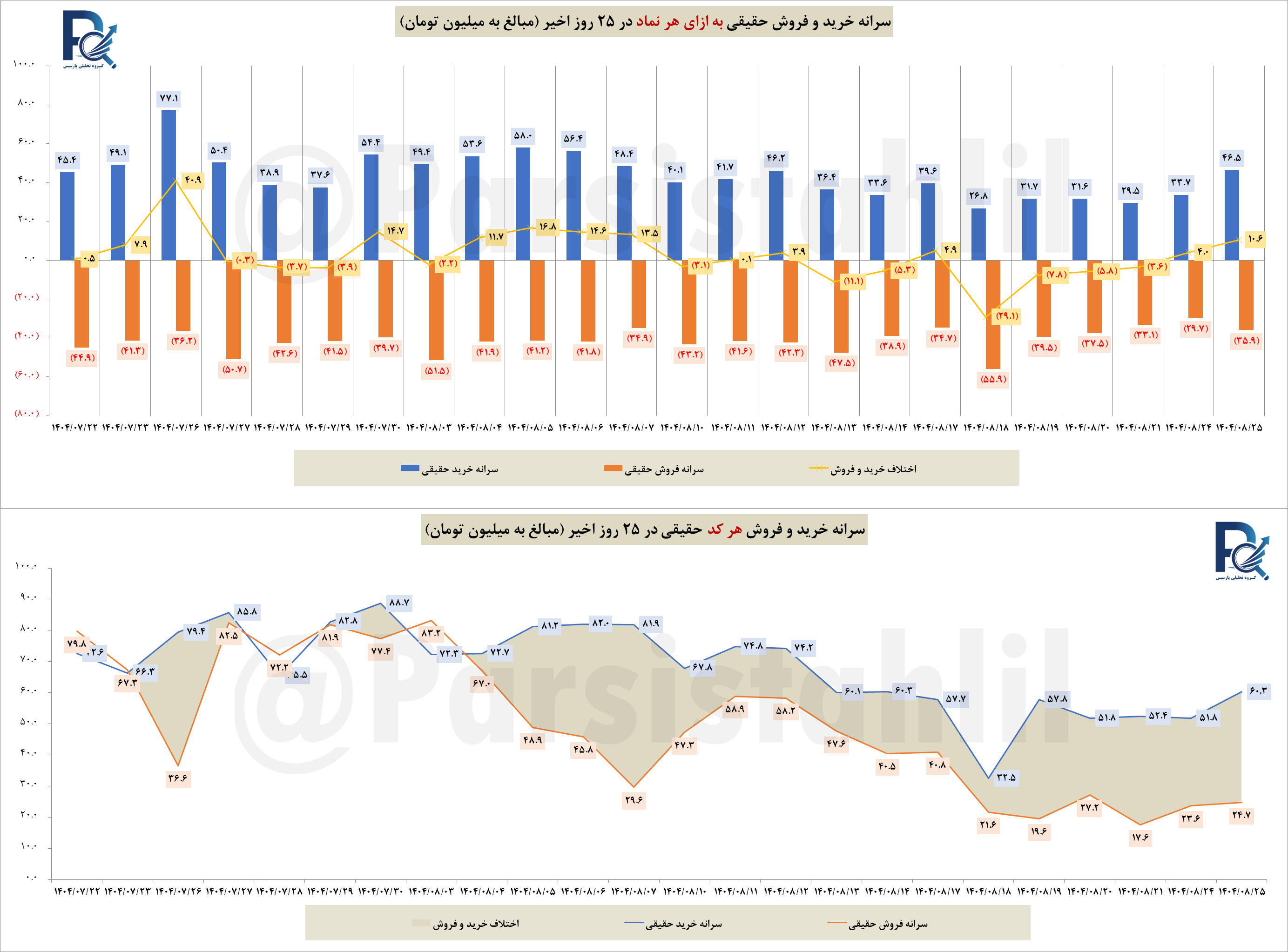 📊دربازار امروز 25 آبان 1404 سرانه خرید هر نماد در بازار ، در حدود 46.5 میلیون تومان و سرانه فروش در حدود 35.9 میلیون تومان بود.