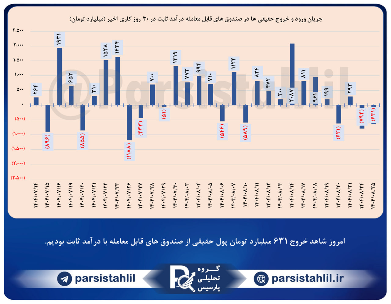 📊 امروز شاهد خروج 631 میلیارد تومان پول حقیقی از صندوق های قابل معامله با درآمد ثابت بودیم.