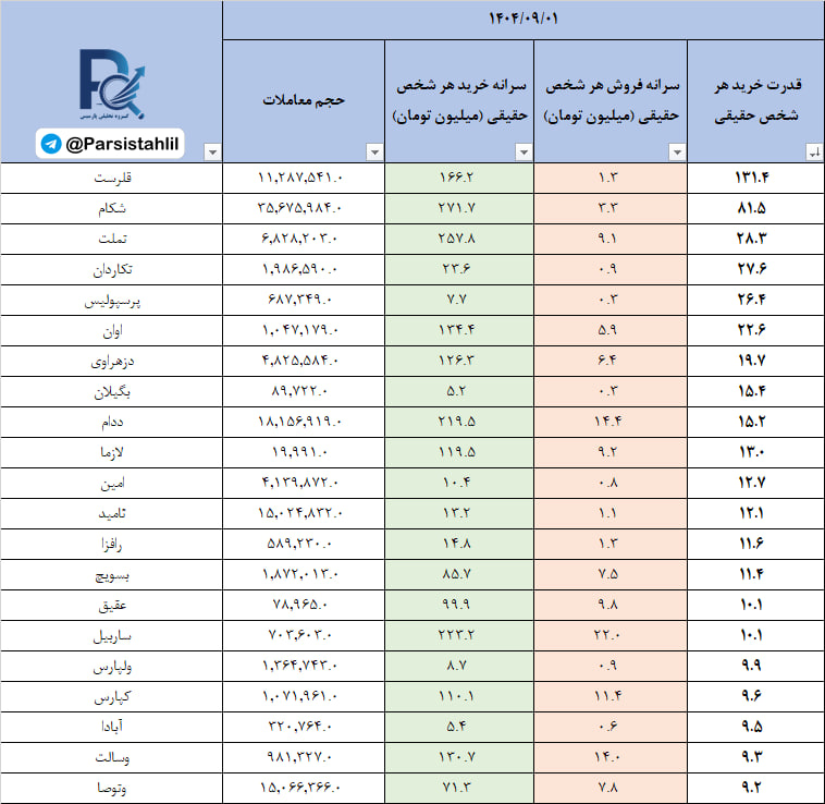 در جدول فوق نمادهایی که بالاترین نسبت سرانه خرید به سرانه فروش مشتریان حقیقی (قدرت خریدار حقیقی) در بازار امروز داشته اند قابل مشاهده است.