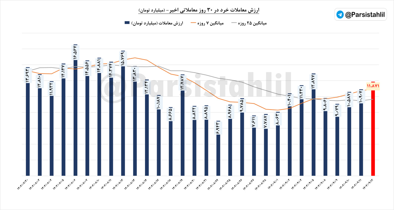 📊ارزش معاملات #خرد (سهام+حق تقدم+صندوق های سهامی) امروز بازار مورخ 12 آذر 1404 مبلغ 11871 میلیارد تومان بود.