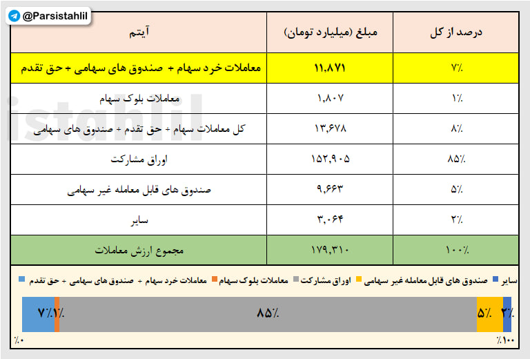 همانطور که در جدول فوق مشاهده می نمایید ارزش کل معاملات امروز بازار 179,310 میلیارد تومان بوده که از این مبلغ 11,871 میلیارد تومان آن مربوط به معاملات خرد سهام و حق تقدم و صندوق های سهامی بوده است.