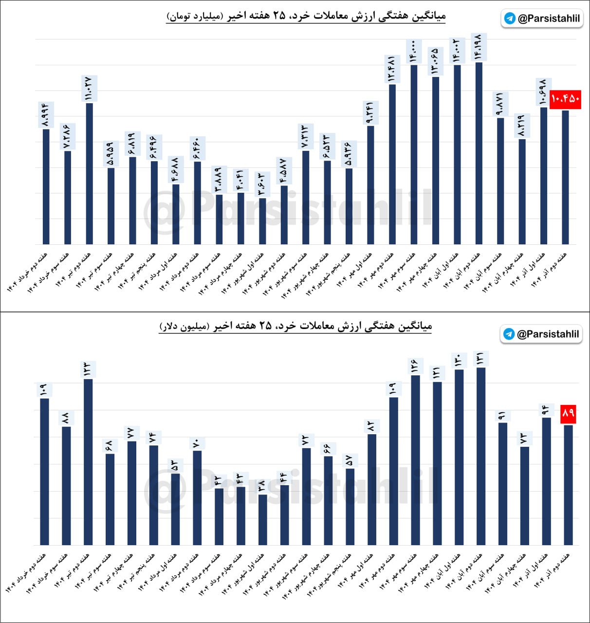 میانگین هفتگی معاملات خرد (ارزش معاملات دلاری) هفته دوم آذر 1404 به 89 میلیون دلار رسید.