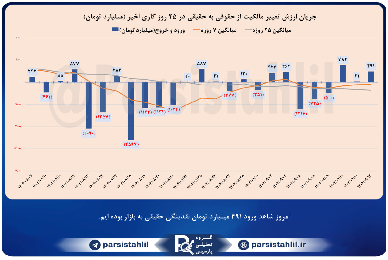 در بازار امروز 1404/09/12 مجموعا مبلغ 491 میلیارد تومان ورود حقیقی به بازار داشته ایم. (سهام + حق تقدم + صندوق های قابل معامله سهامی)