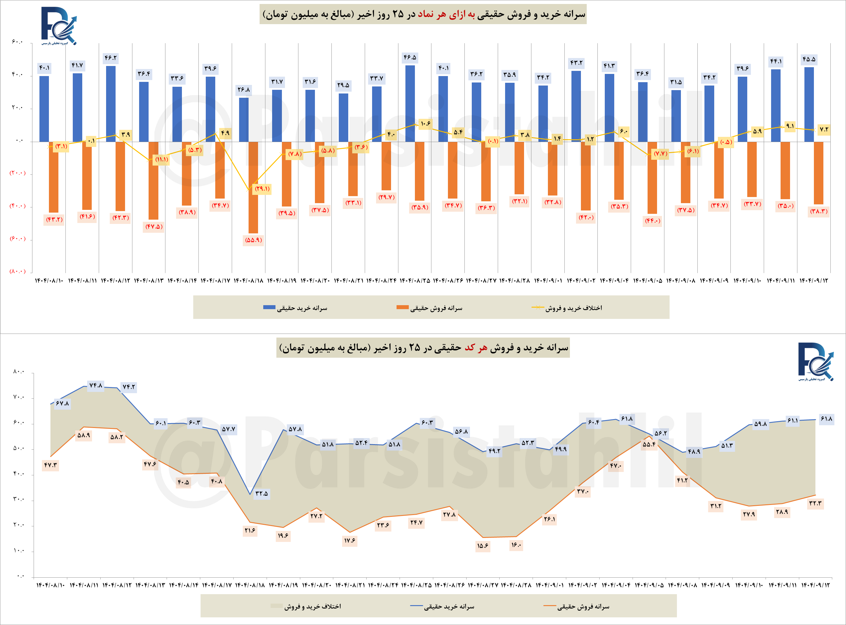همچنین، در بازار امروز به ازای هر کد (میانگین نمادها) ، سرانه خرید حقیقی در حدود 61.8 میلیون تومان و سرانه فروش در حدود 32.3 میلیون تومان بود.
