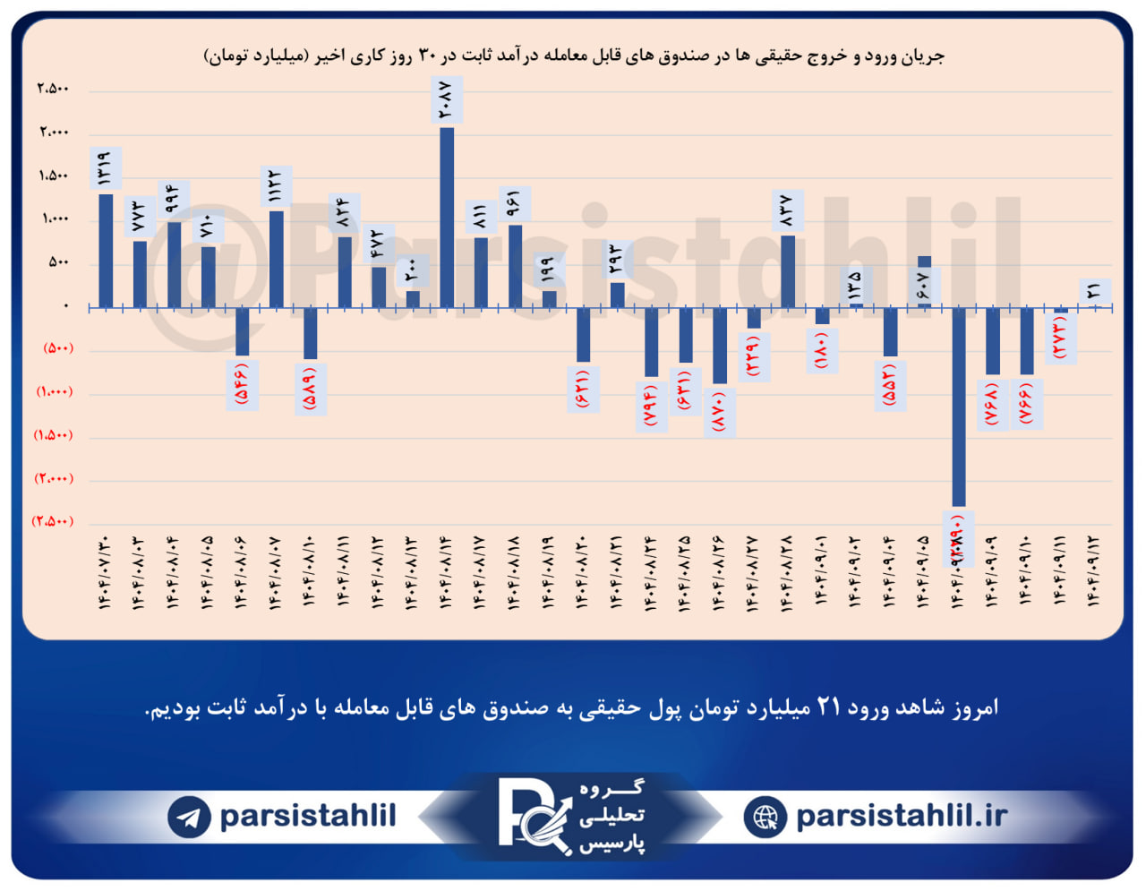 📊 امروز شاهد ورود 21 میلیارد تومان پول حقیقی به صندوق های قابل معامله با درآمد ثابت بودیم.
