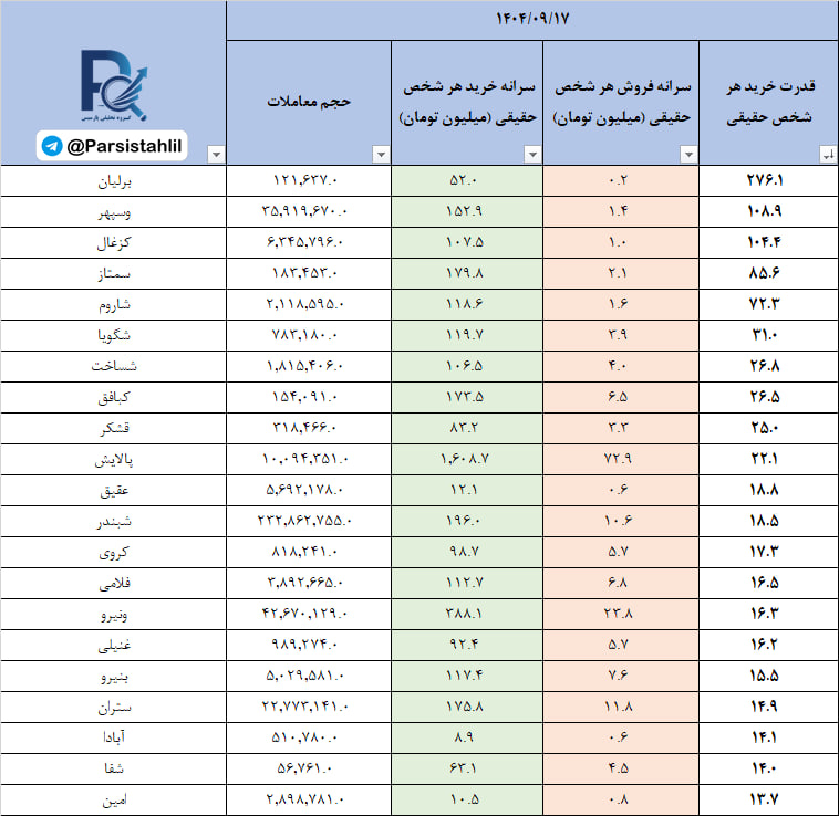 در جدول فوق نمادهایی که بالاترین نسبت سرانه خرید به سرانه فروش مشتریان حقیقی (قدرت خریدار حقیقی) در بازار امروز داشته اند قابل مشاهده است.