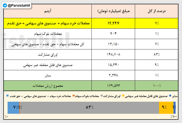 همانطور که در جدول فوق مشاهده می نمایید ارزش کل معاملات امروز بازار 179,566 میلیارد تومان بوده که از این مبلغ 12,247 میلیارد تومان آن مربوط به معاملات خرد سهام و حق تقدم و صندوق های سهامی بوده است.
