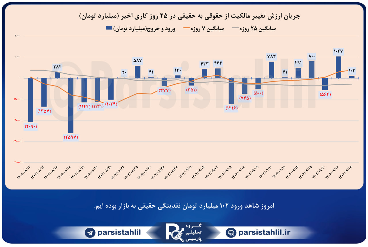 در بازار امروز 1404/09/18 مجموعا مبلغ 102 میلیارد تومان ورود حقیقی به بازار داشته ایم. (سهام + حق تقدم + صندوق های قابل معامله سهامی)