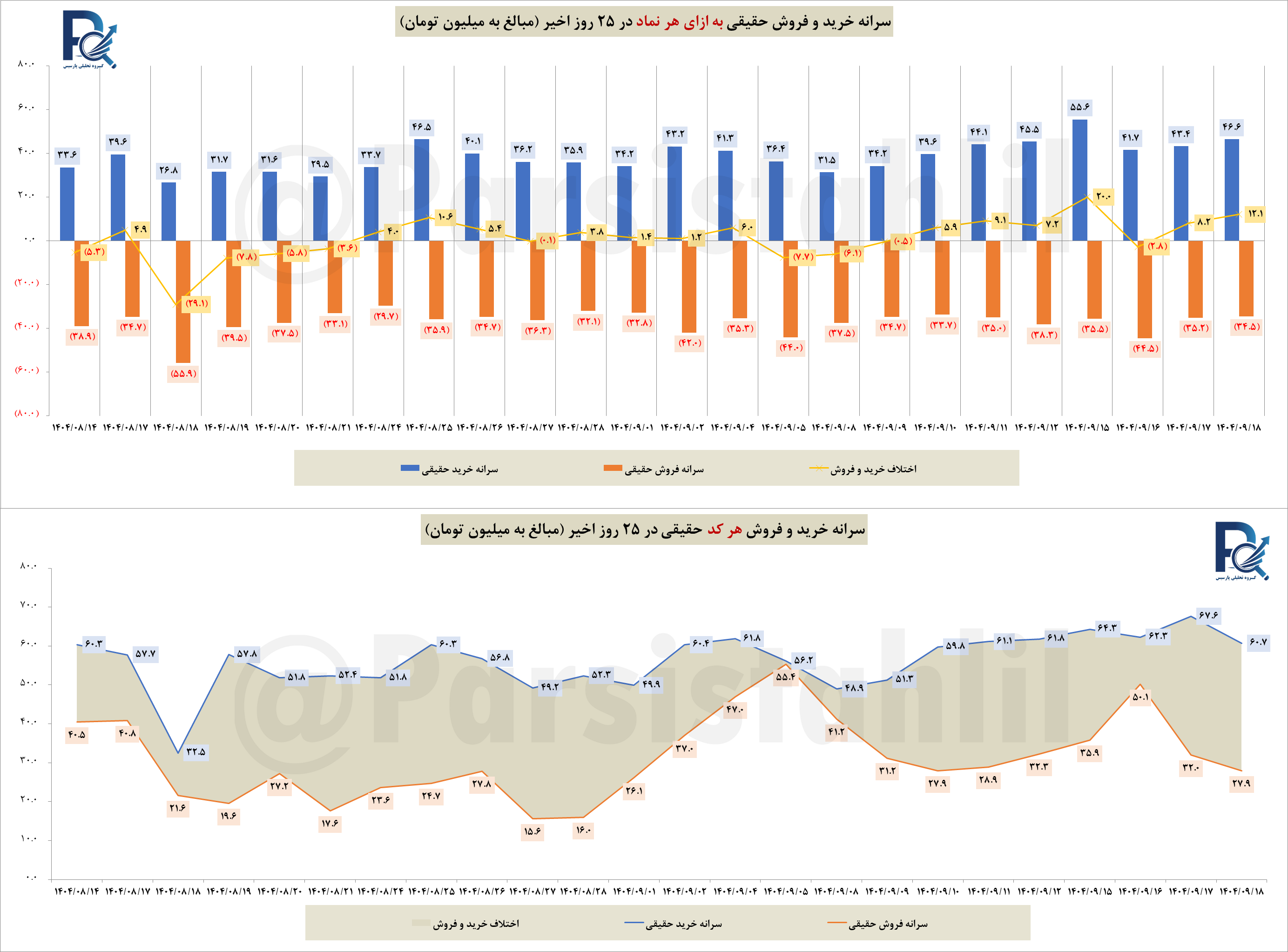 همچنین، در بازار امروز به ازای هر کد (میانگین نمادها) ، سرانه خرید حقیقی در حدود 60.7 میلیون تومان و سرانه فروش در حدود 27.9 میلیون تومان بود.