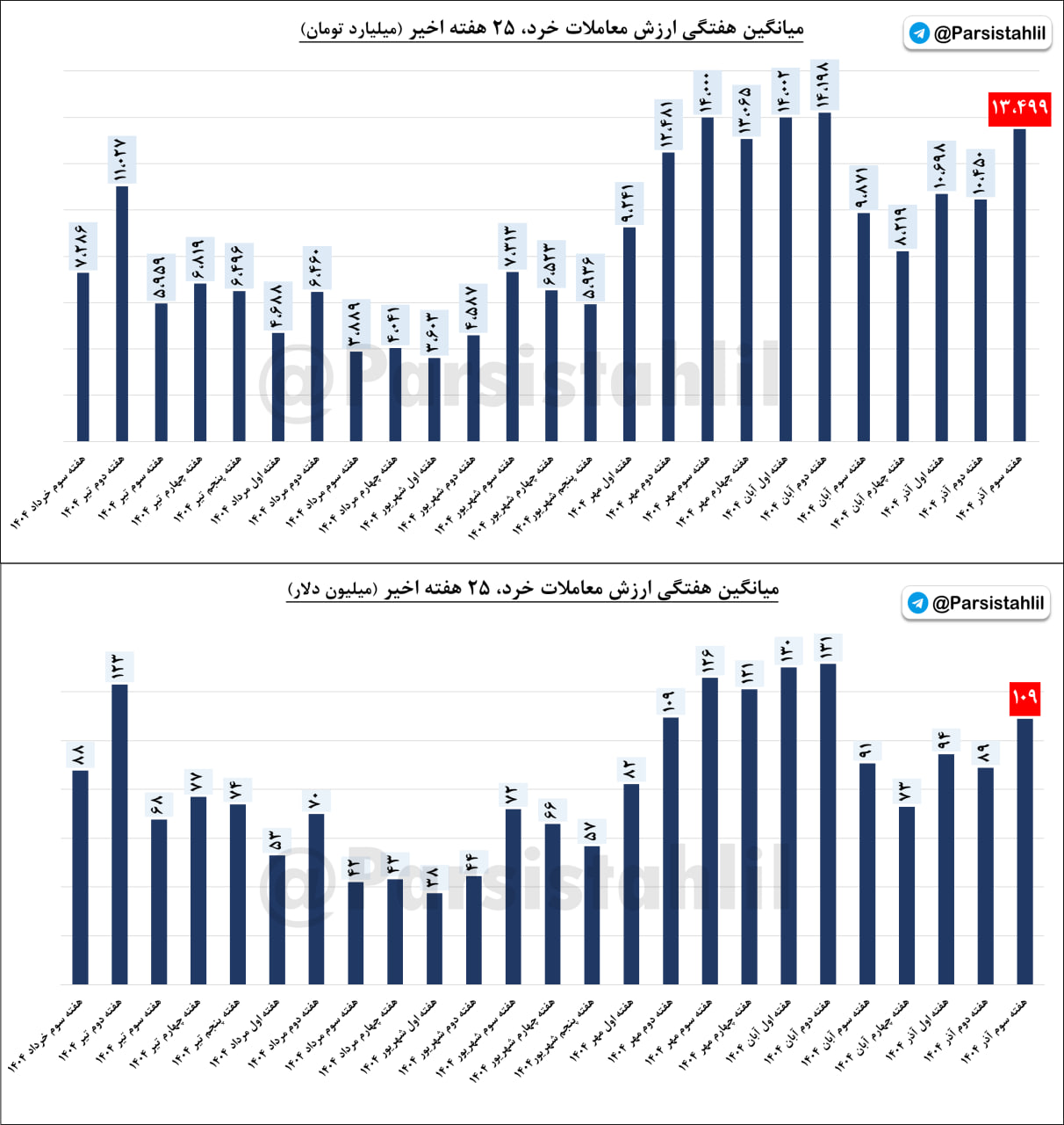 میانگین هفتگی معاملات خرد (ارزش معاملات دلاری) هفته سوم آذر 1404 به 109 میلیون دلار رسید.