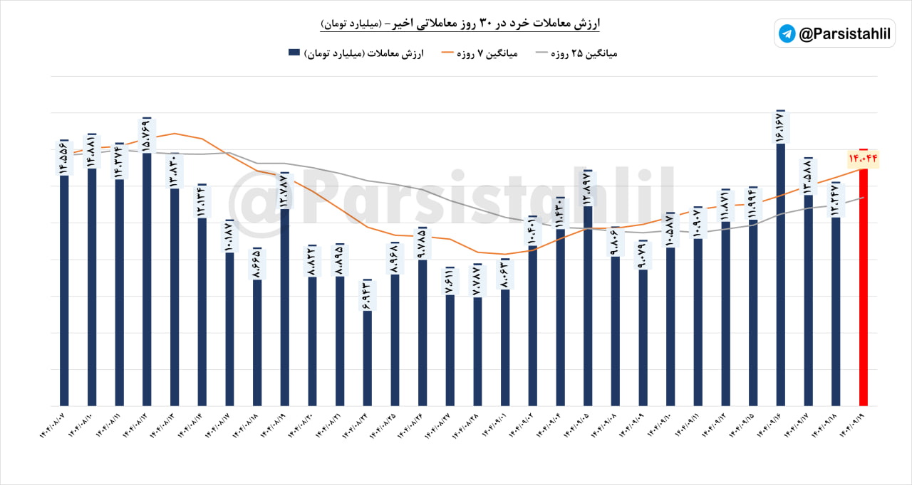 📊ارزش معاملات #خرد (سهام+حق تقدم+صندوق های سهامی) امروز بازار مورخ 19 آذر 1404 مبلغ 14044 میلیارد تومان بود.